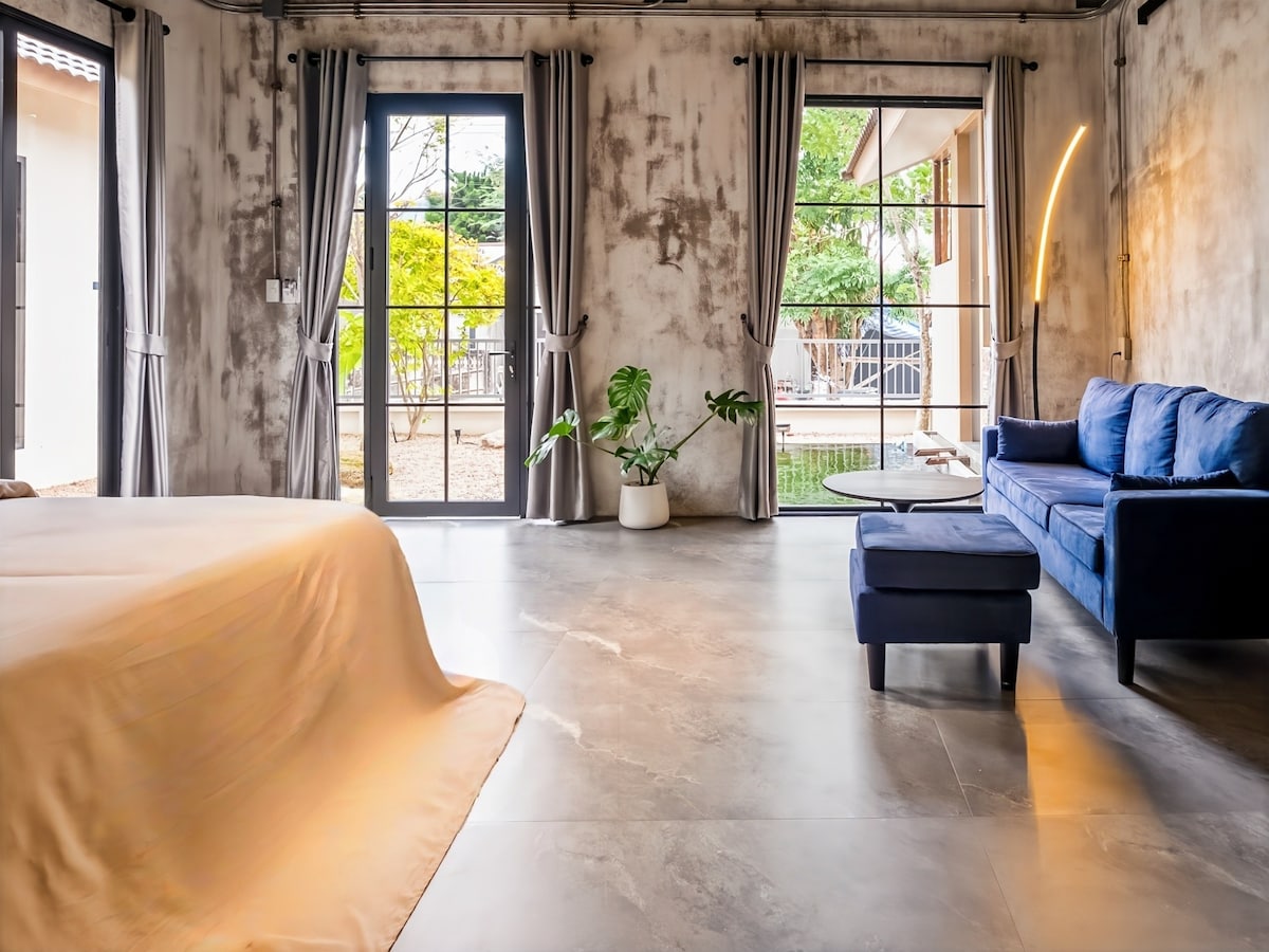 Tell guests what your place has to offer: Escape to a stylish 24m² industrial loft designed for relaxation and inspiration. Featuring raw concrete textures, vibrant modern art, and floor-to-ceiling windows, this ground-floor studio blends urban chic with nature. Wake up in a plush King bed, enjoy coffee by the garden, and unwind in your private artistic sanctuary. Perfect for couples or solo travelers seeking a unique, photogenic retreat.