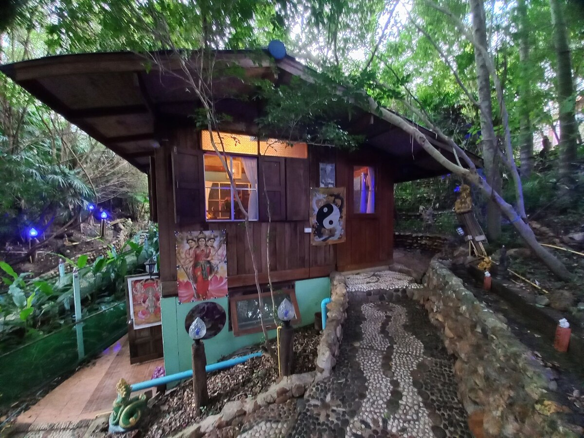 A tiny house hiding behind “ Cheese Madness” on bar & walking street in Pai town. In this house we put a queen size bed upstairs with a small balcony for smoking and downstairs we had 50 inches smart tv, sofa bed, dining table, microwave, kettle, toaster, fridge, cutlery. Rain shower&big bathtub in the toilet. UV blackout curtains in the house. * at night you can hear music from the bar because it’s on bar & walking street. Car parking at “ Don’t cry cafe” 20 meters before the house with cctv.