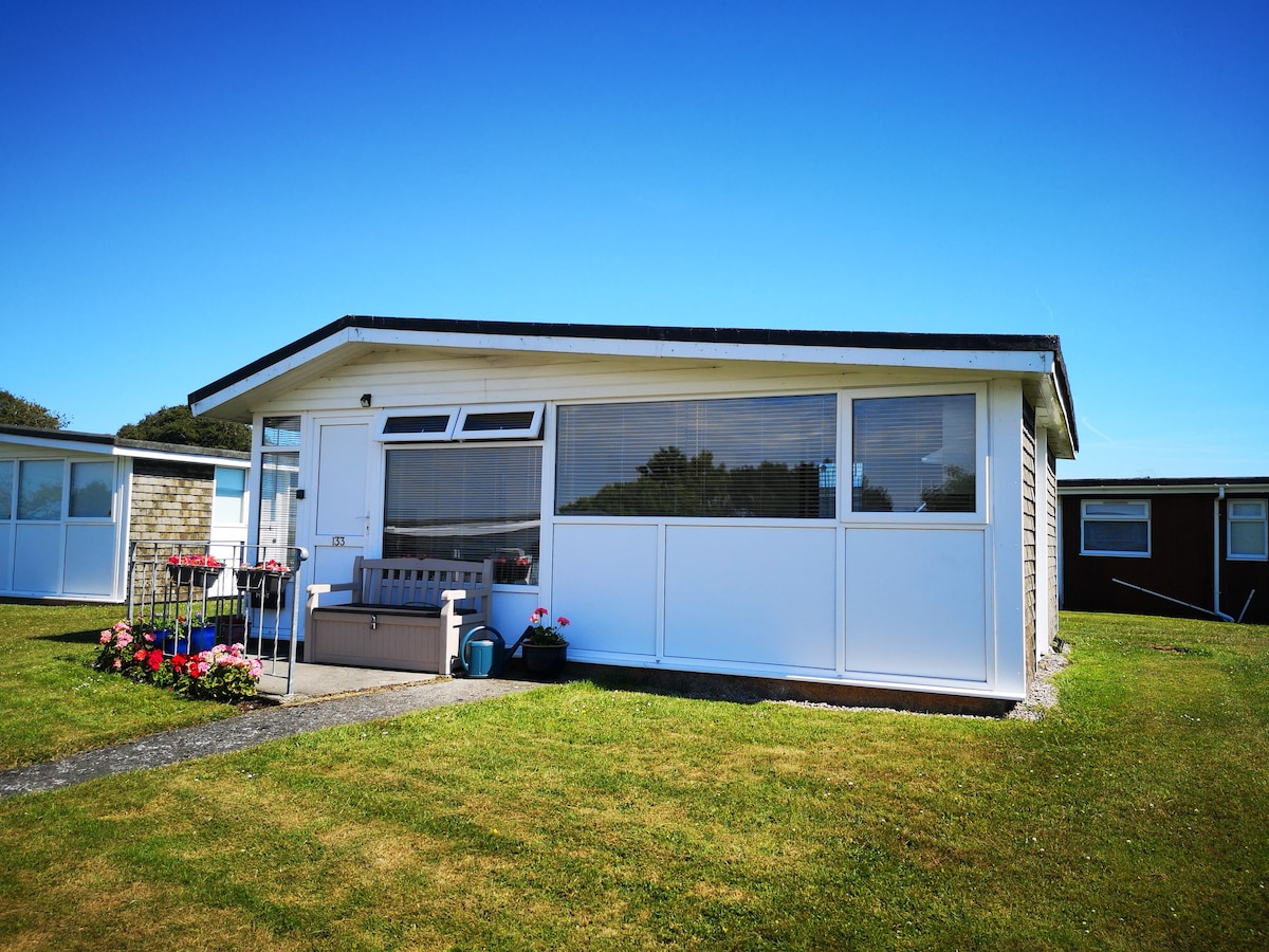 - Detached bungalow chalet on quiet holiday park just outside Dartmouth views over surrounding countryside - Double & twin bedroom - Kitchen w/ dining table, washing machine, fridge freezer, microwave and utensils - Living room w/ TV, x 2 sofas, patio doors to grassed area with views -Bathroom w/ bath, electric shower, basin, WC electric towel rail and under floor heating if required - Electric by £1 coin meter - Shared lawns surround the chalet, seats and tables to front and rear