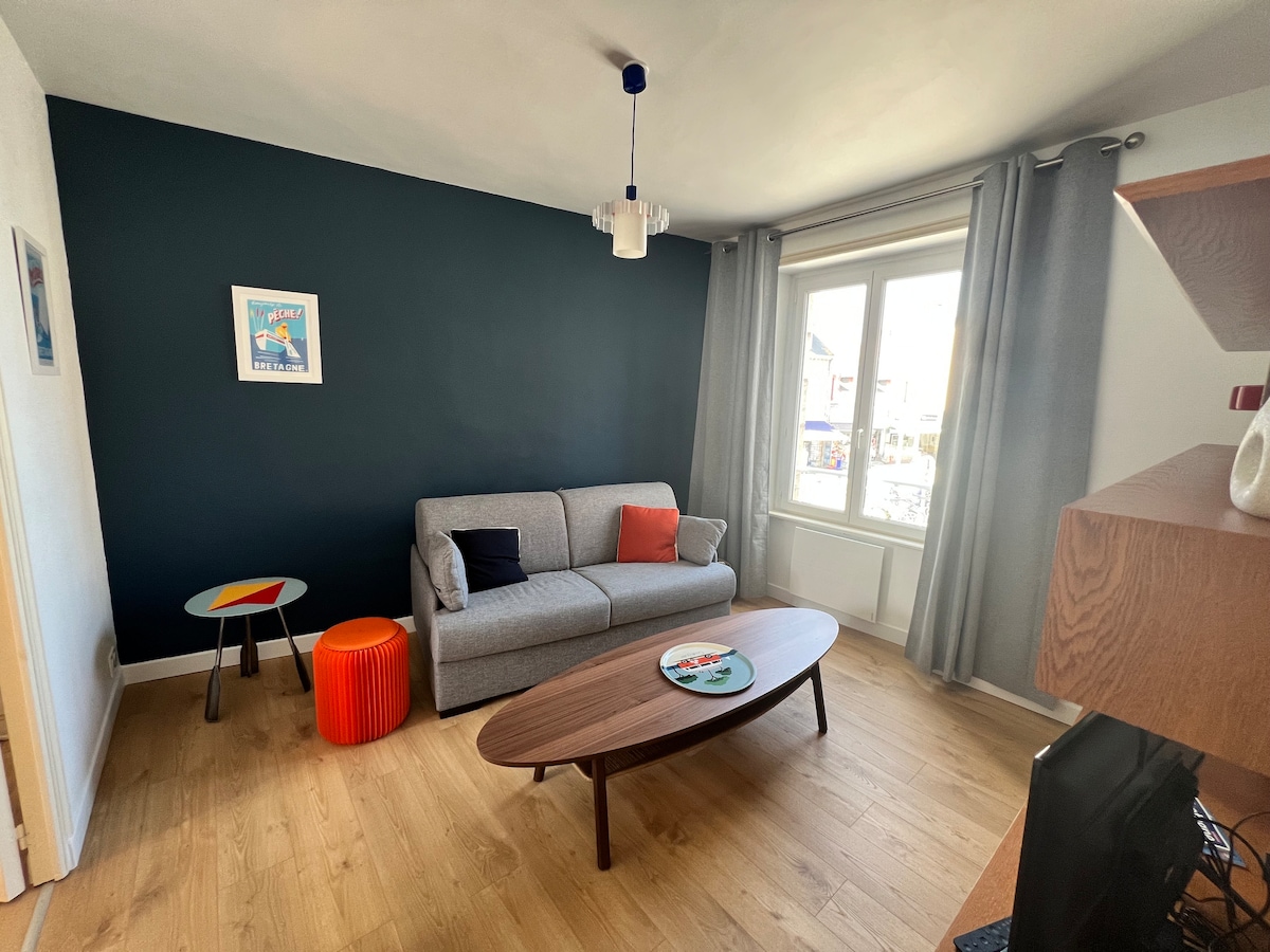 Appartement chaleureux et calme de 3 pièces, très bien situé au coeur de ville, très lumineux et traversant, au 1 étage d'un petit immeuble en début de rue piétonne. Accès 3 mn à pied du port, commerces, services et restaurants, cinéma et accès rapide à la plage de la Tossen, piscine, GR, bus, gare. Parking privé extérieur visible des chambres, interphone. Literie de qualité (dont grand lit 160). Fourniture draps, lits faits à votre arrivée, serviettes, torchon et essui-mains.