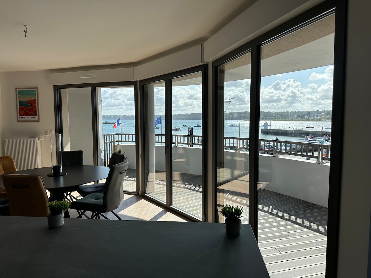 Vue sur le port de plaisance de Paimpol de toutes les pièces. Au niveau 2 d’un immeuble de standing récent, calme, double vitrage, avec ascenseur Grande pièce à vivre très claire pleine vue sur la mer : salon et salle à manger Kitchenette équipée ouverte Terrasse couverte Chambre vue mer. Literie de qualité 160/200 Salle d’eau Entièrement équipé à neuf Linge de lit, de toilette et torchons fournis 100% coton Parking gratuit, commerces et restaurants à proximité JUILLET ET AOÛT 4 NUITS MINIMUM