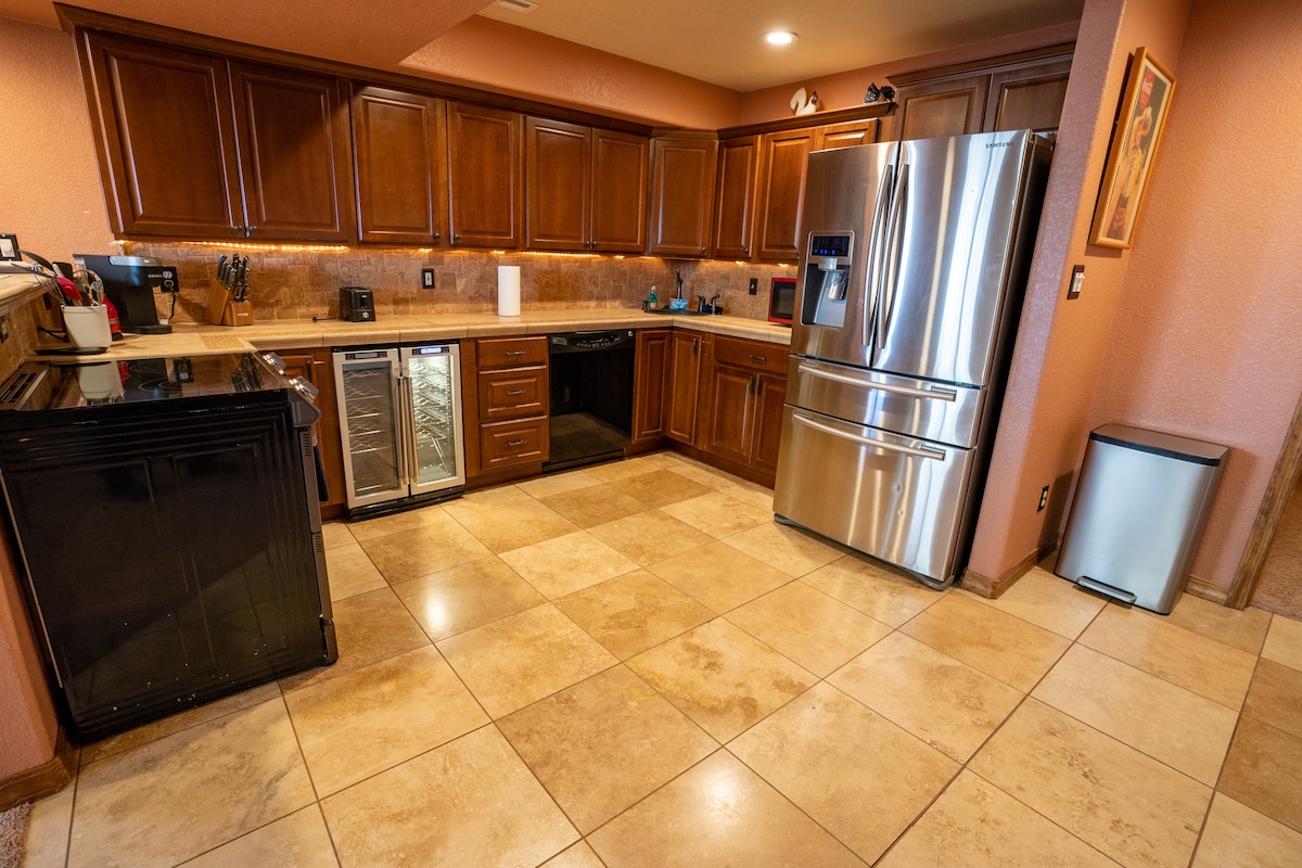 Gather your family and friends to enjoy a bohemian style home with breathtaking mountain views. Feel a sense of peace by sitting on the hanging chairs. Make a home cooked meal with our fully equipped kitchen. Lay back and relax, pick your favorite movie and play it on a 110"+ HD projector equipped with sound system. Popcorn machine with butter and popcorn seasonings. Savor the outdoors on a 16,000 sqft lot! Basketball hoop on the premises. Trails, sunsets & more.