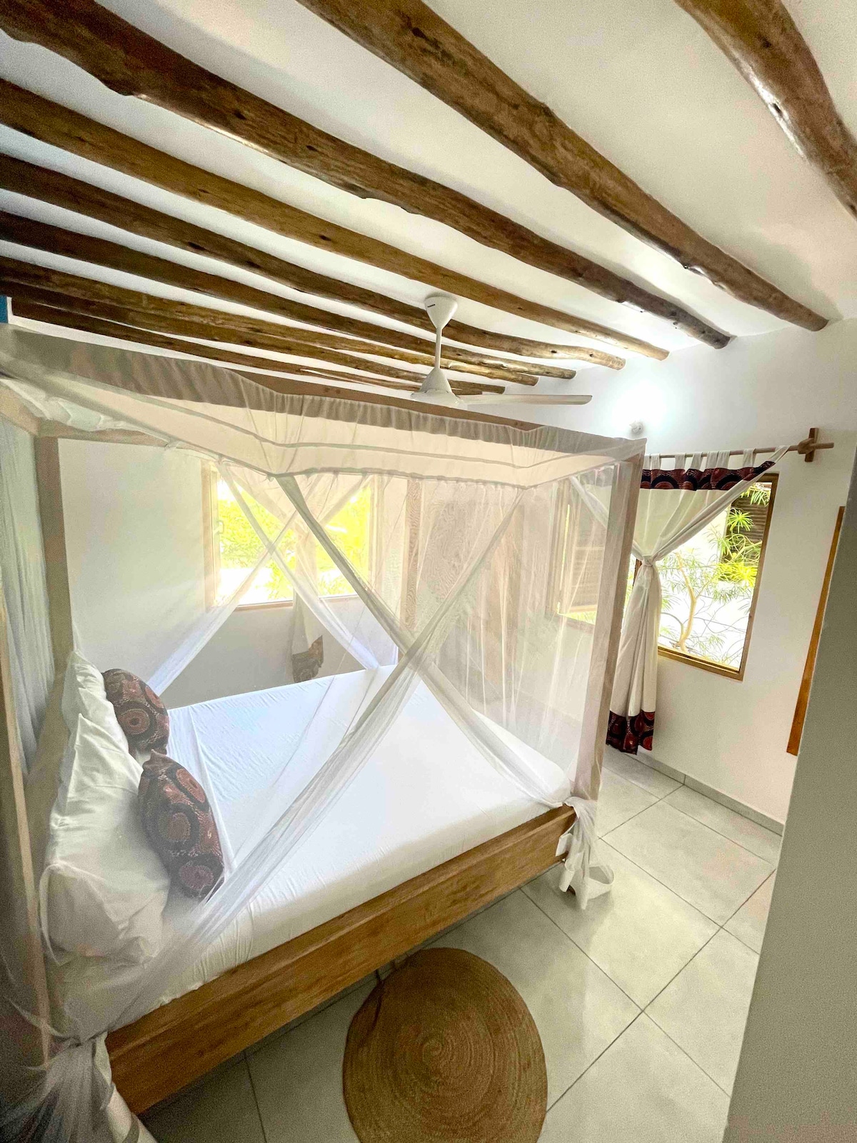 @VillaAmaya_zanzibar, located in the most friendly village in the South East Coast, with all local shops and amenities at walking distance. This beautiful huge 1st floor master bedroom has a comfortable and very large 6x7 ft bed, plus a small single bed and an ensuite bathroom. With a large terrazo bathtub and lots of wardrobe space. All doors are mosquito netted. Breakfast included. Fitted with solar energy. Garden and kitchen shared communal space which you’re welcome to use.