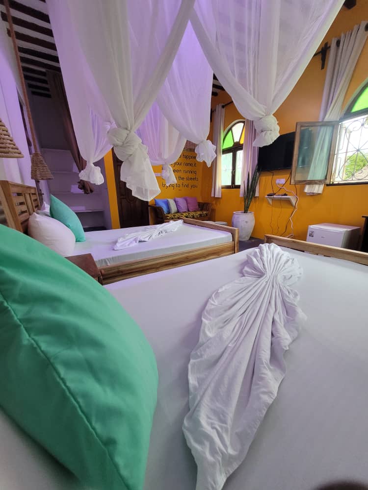 Just a few steps away from the Indian Ocean! UHURU top floor apartment, super king size bed and sofa bed in living room. Fully equipped kitchen, dining/living area. Situated in Jambiani Mfumbwi with the most beautiful turquoise water you ever seen. TV with Netflix access, AC rooms, Fast Wi-Fi, daily housekeeping, private parking, terrace and security, safe box, Iron and boards, hair dryer. There is no such a place like this in whole Zanzibar! Private roof top terrace with sun set/sun rise view