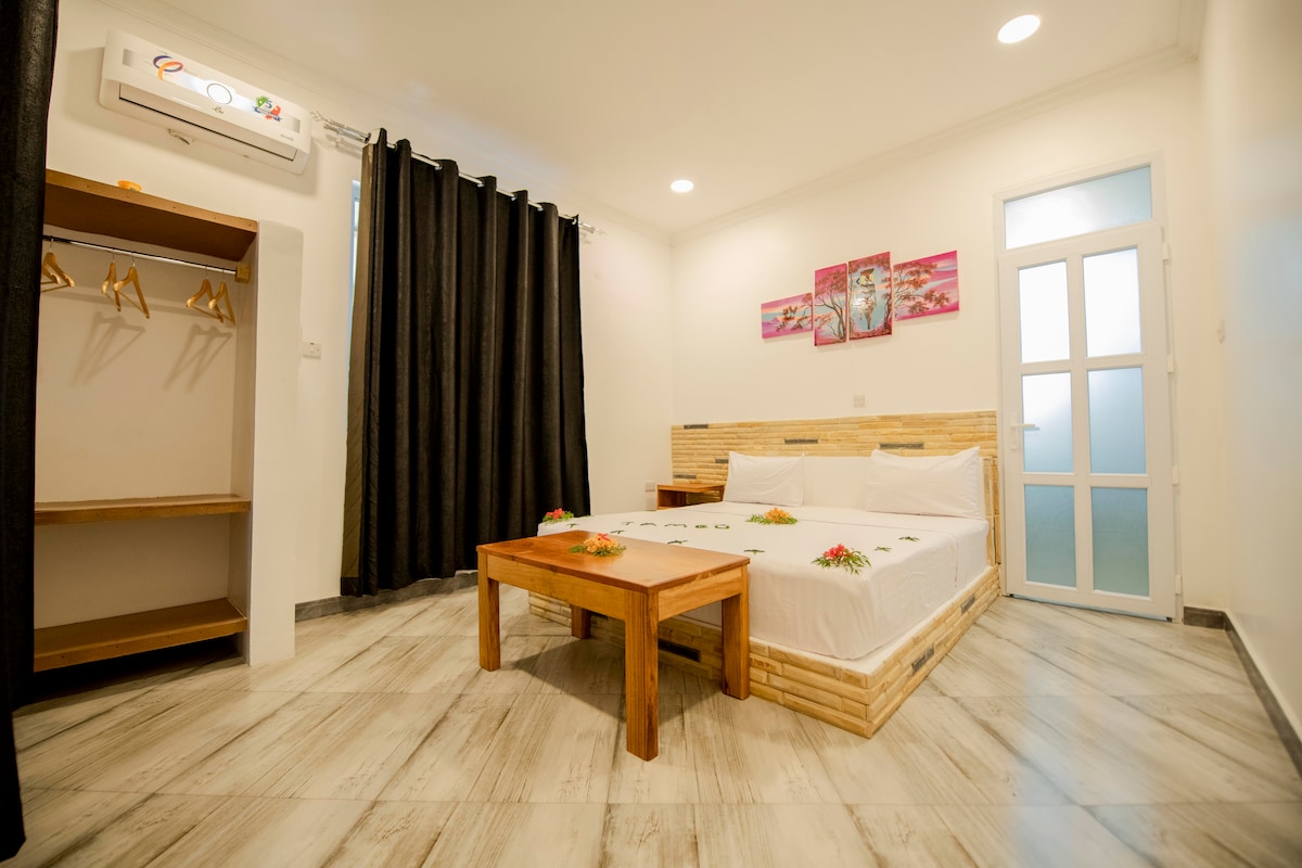 Finde Platz und Komfort in unserem großzügigem Zimmer im hinteren Bereich der Anlage. Das antike, zeitlose Design mit marokkanischen Elementen lädt zum Wohlfühlen ein, das Kingsize-Bett sorgt für erholsame Nächte & ein Schlafsofa bietet Platz für weitere Gäste. Ausstattung im Detail: - privates Badezimmer mit Dusche (keine Tür, mit Vorhang abgetrennt) - private Terrasse - Gartenbereich mit Hängematte - Deckenventilator - weitere Matratze auf Anfrage - tägl. Housekeeping - Basis-Frühstück inkl.