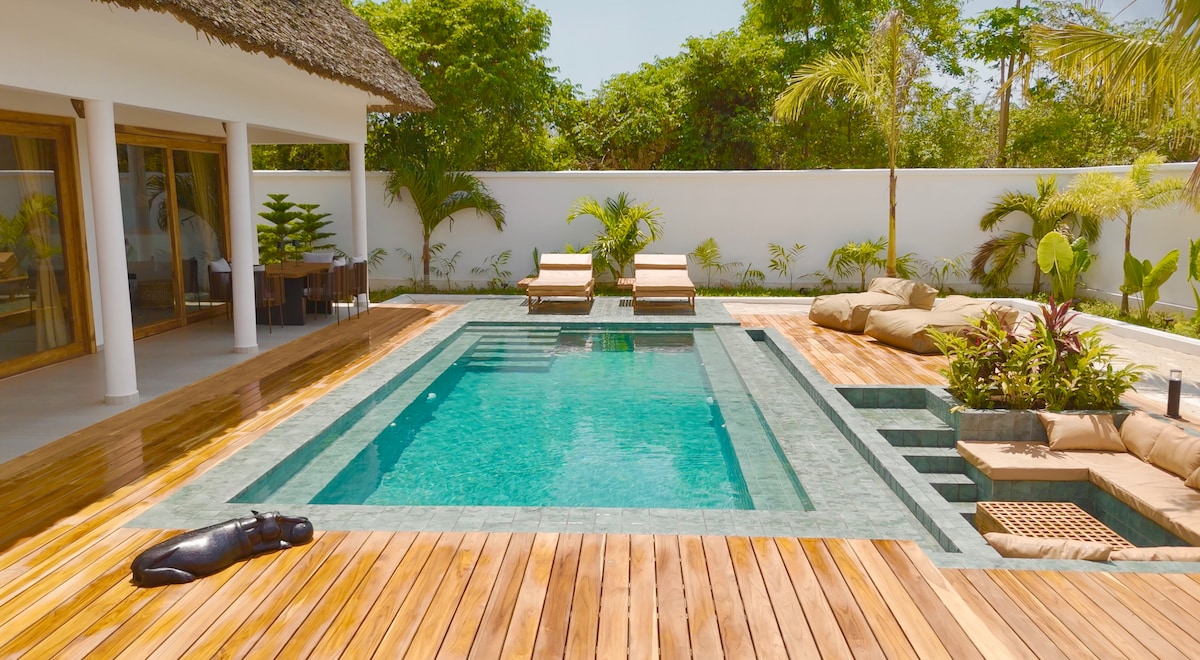 A new fully furnished 2 bedroom villa with full security with a swimming pool and astonishing garden, perfect for honeymooners, family or friends. Located at Jambiani less than a min walk to main road, 3 min walk to the beach. 5 min drive to Paje. Opposite of Shanti Cafe where you can get services like yoga, breakfast, lunch and dinner Full privacy including swimming pool Relax with the whole family at this peaceful place to stay.