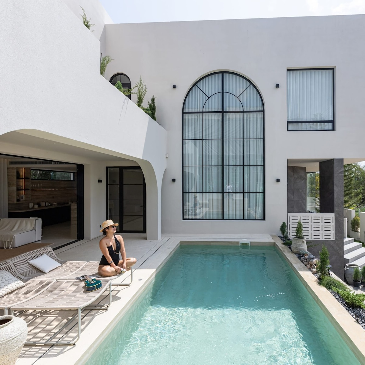 Relax in a Tuscan-style pool villa with a long swimming pool overlooking the Khao Yai mountains, set in one of the area’s most beautiful villages. Surrounded by lush greenery, the villa features warm Italian-style décor with understated elegance. This is a full private-villa stay on over 0.4 acre, including the garden, pool, and all living spaces for your group. Beds are available for max-six guests; for larger groups, a tent or sofa can be arranged, with shared bathroom facilities with others
