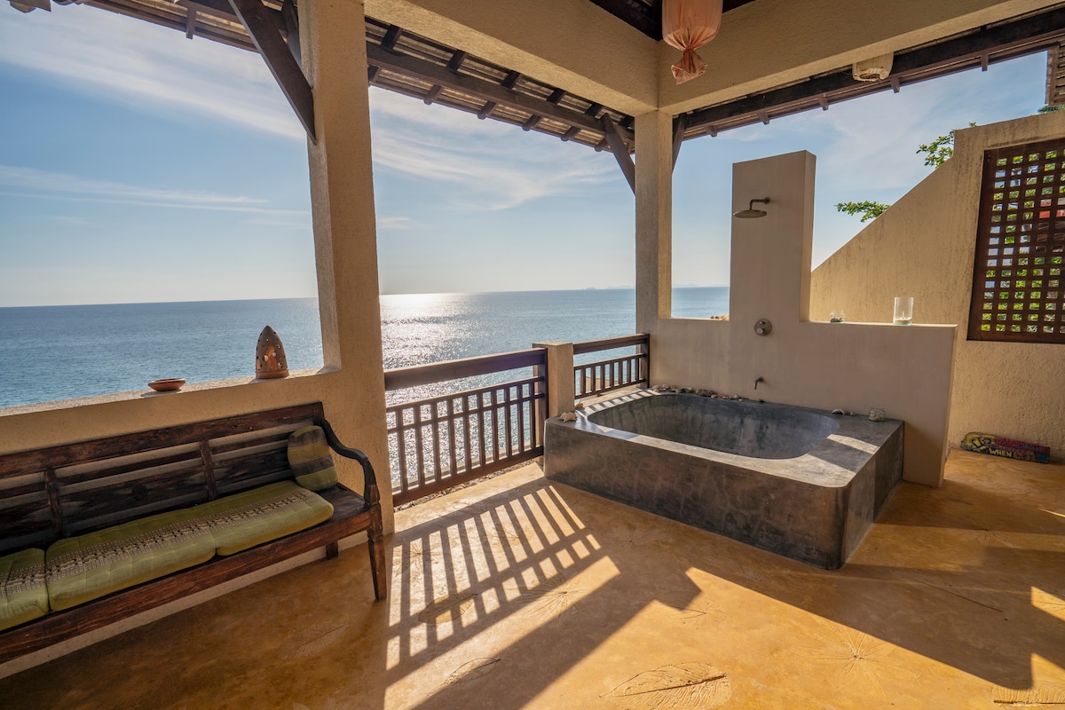 Experience ultimate tranquility in a charming bamboo hut on your own private beach. Surrounded by nature, enjoy the soothing sound of waves crashing on the shore. Unwind in the steam room or take to the water with included kayaking adventures. Perfect for a peaceful escape, this retreat offers relaxation, privacy, and a true connection with nature. This is a secluded area, located at a distance from the main town.