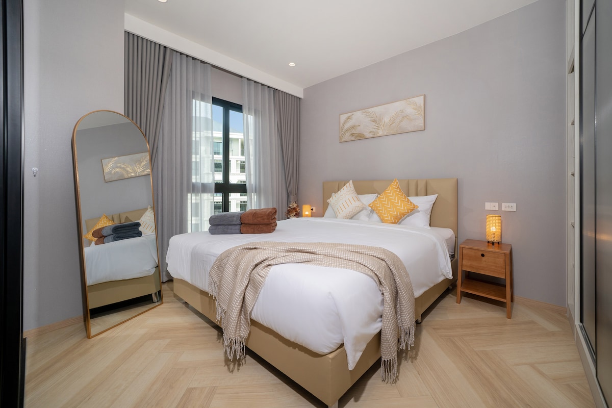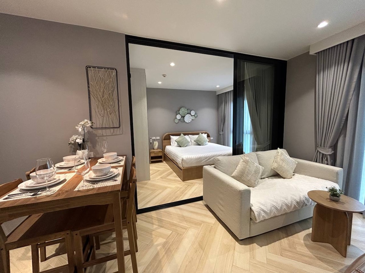 A 28 sqm one-bedroom suite, perfect for 1-2 guests, featuring: -Fully equipped kitchen -Private bathroom -Small balcony -Smart TV -Private high-speed WiFi -Air-conditioner -Washing machine -Queen Size bed -2 swimming pools -Gym -Co-working space -Outdoor shower area - No smoking in the room. - If you have a car, please inform us of the type of car in advance