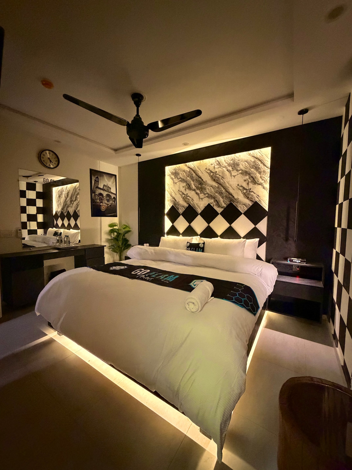 Studio bed room with safe and secure environment. LUXURY ACCOMMODATION Relax in style with our elegantly furnished rooms designed for comfort, convenience, and a touch of class. 24/7 ROOM SERVICE Enjoy delicious food and beverages delivered right to your room anytime with our round-the-clock service. Indulge in our luxurious services with Free Breakfast, Haircut and beard, Laundry , Disposable kit, Dry Fruits, Fresh Fruits, Mineral water.These are all complimentary during the stay.