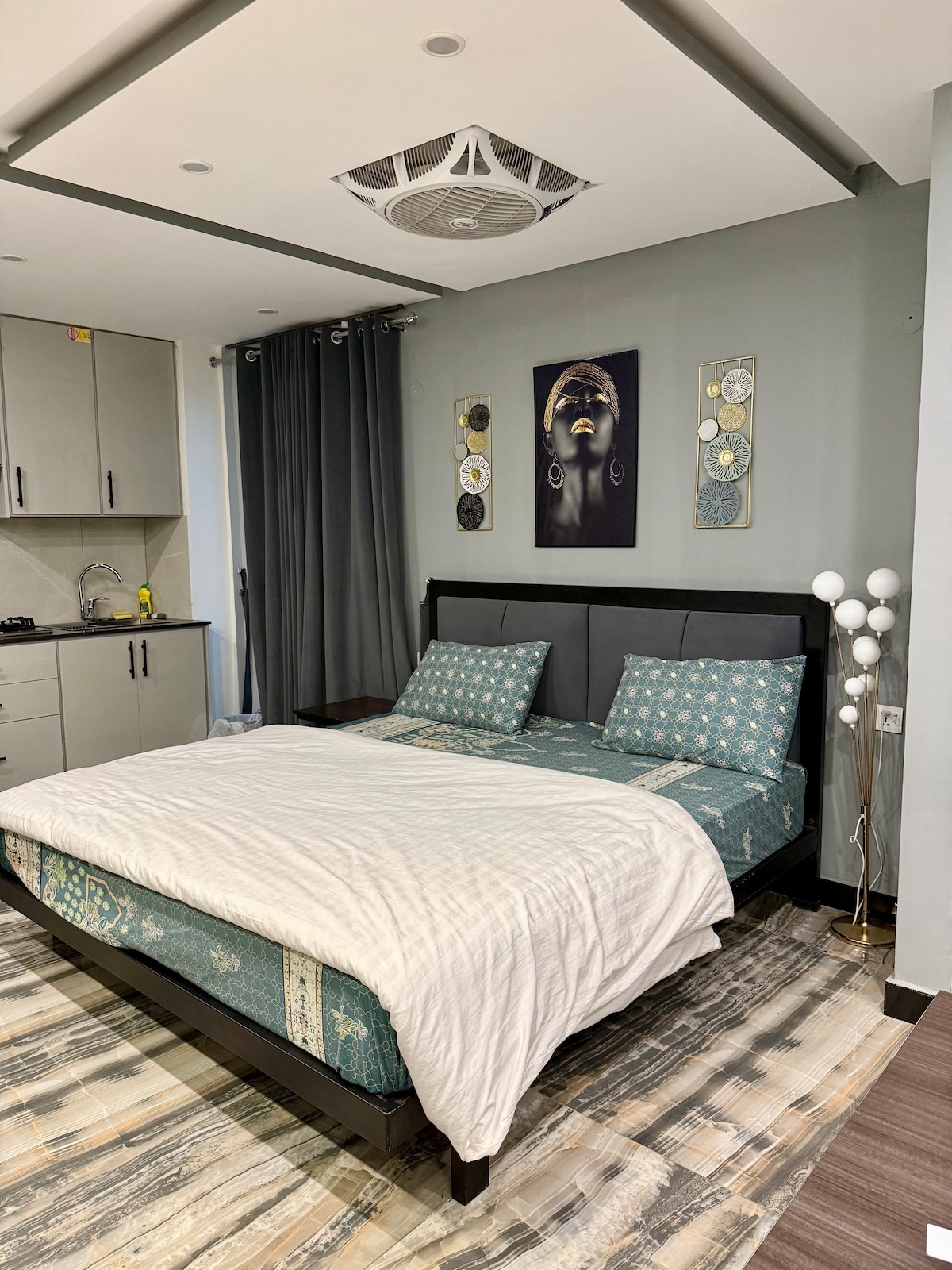 Our 1 BR condo in DHA Phase 5 is where urban chic meets celestial cool. Think: a glowing moon wall for those late-night selfies and a bold dollar-stacked art piece that screams "main character energy" Wake up to park views from your private balcony swing, binge your faves on the 50" 4K Smart TV, or cook up something aesthetic in the fully loaded designer kitchen. The interiors? Abstract, stylish, and made for the feed. Plus, you're right next to Lahore's hottest dining spots.