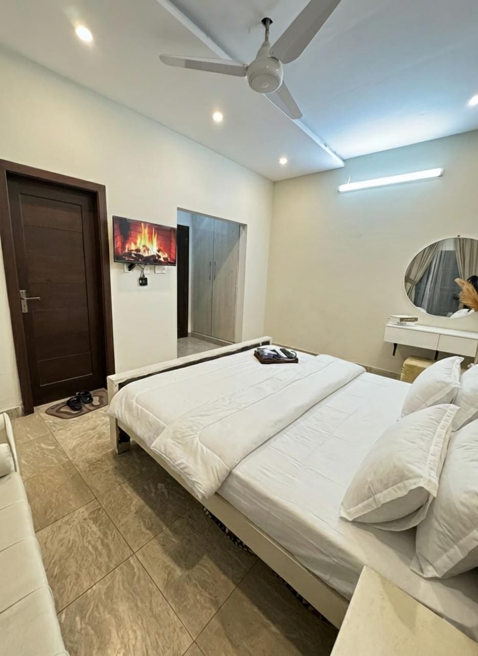 Our 1 BHK Orbit Penthouse in DHA Phase 5 is where urban chic meets celestial cool. Think: a glowing moon wall for those late-night selfies and a bold dollar-stacked art piece that screams "main character energy" Wake up to park views from your private balcony swing, binge your faves on the 50" 4K Smart TV, or cook up something aesthetic in the fully loaded designer kitchen. The interiors? Abstract, stylish, and made for the feed. Plus, you're right next to Lahore's hottest dining spots.