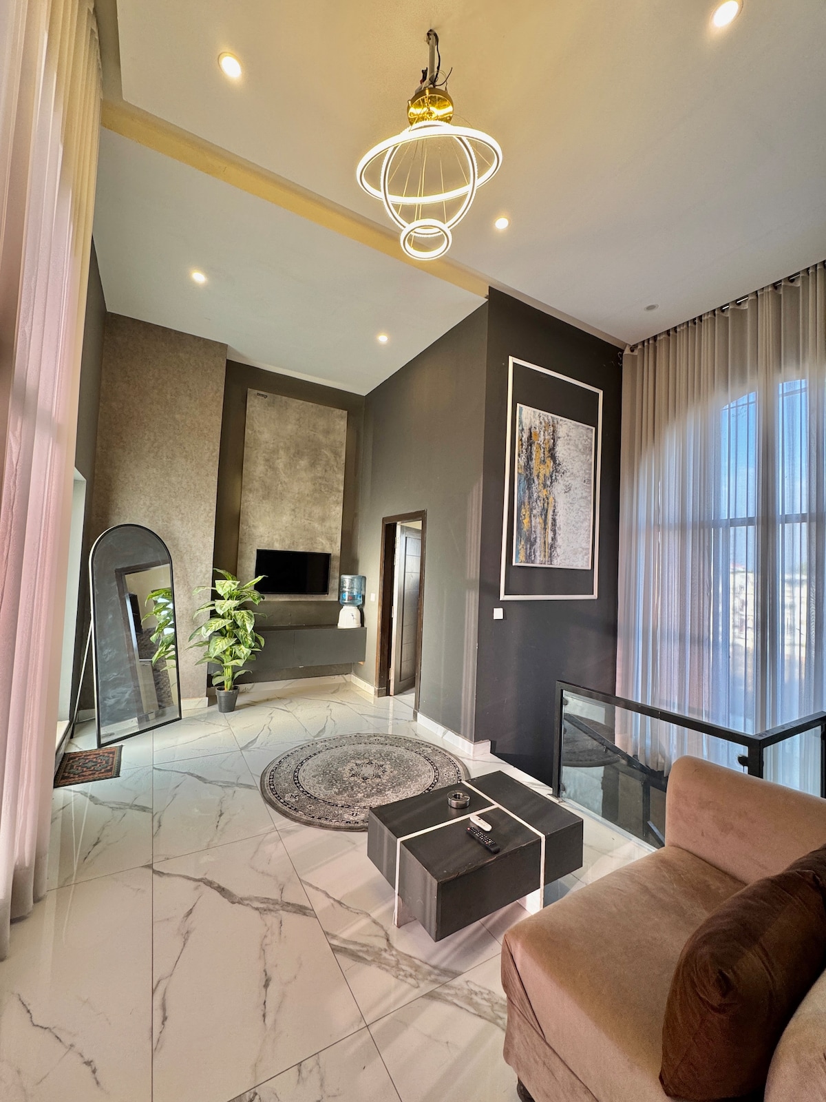 Our 1 BHK Orbit Penthouse in DHA Phase 5 is where urban chic meets celestial cool. Think: a glowing moon wall for those late-night selfies and a bold dollar-stacked art piece that screams "main character energy" Wake up to park views from your private balcony swing, binge your faves on the 50" 4K Smart TV, or cook up something aesthetic in the fully loaded designer kitchen. The interiors? Abstract, stylish, and made for the feed. Plus, you're right next to Lahore's hottest dining spots.
