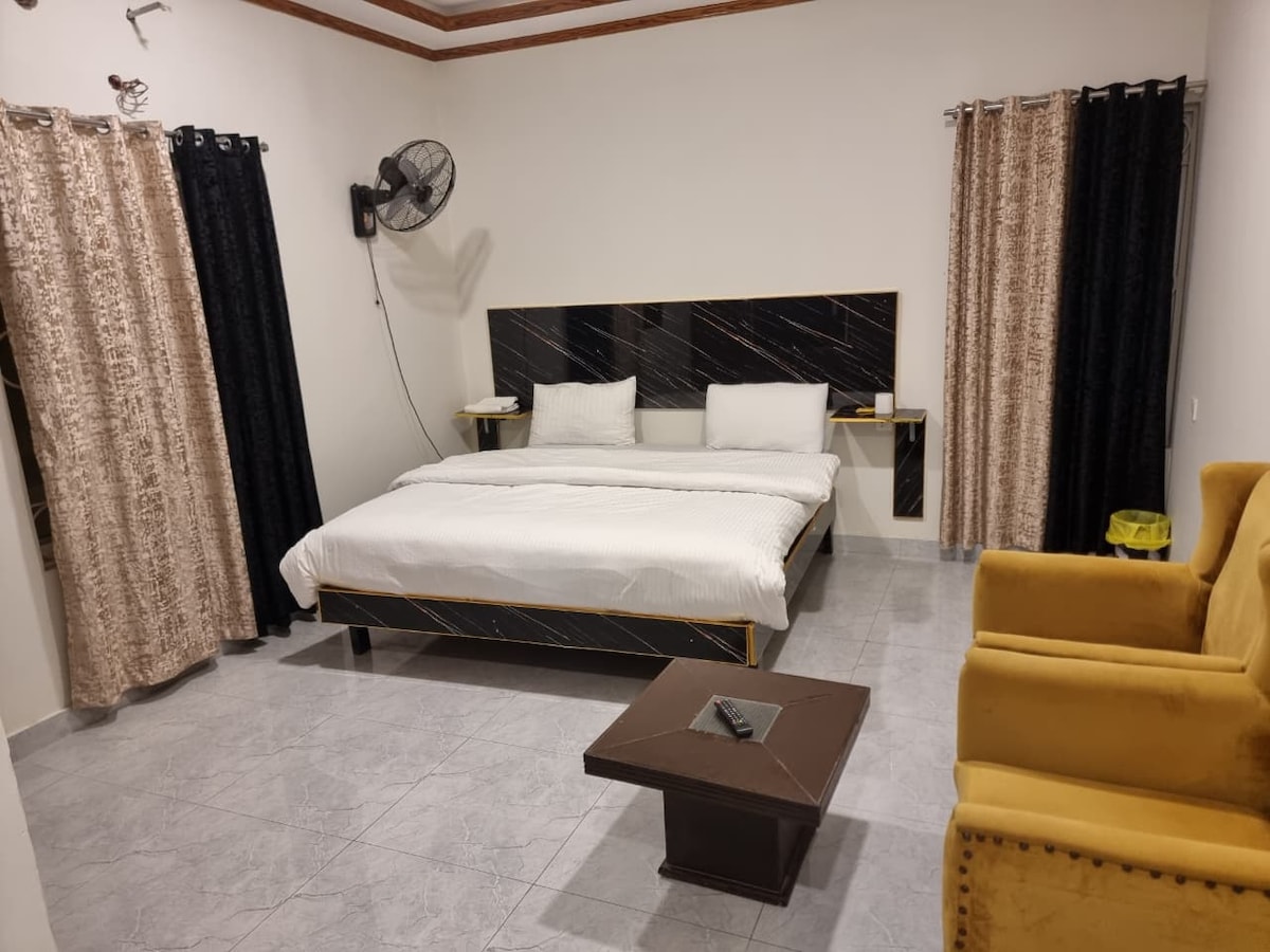 This Executive Room at Hotel Hilla offers a comfortable stay in the peaceful surroundings of Nathia Gali. The room accommodates up to 3 guests and includes one king-size bed and one sofa bed. Each room has a private attached full bathroom with hot water, fresh linens, towels, and essential guest amenities. Guests can access the hotel lobby, on-site restaurant, café, outdoor sitting area, and parking. Heating is available for cooler weather, with staff assistance throughout the stay.