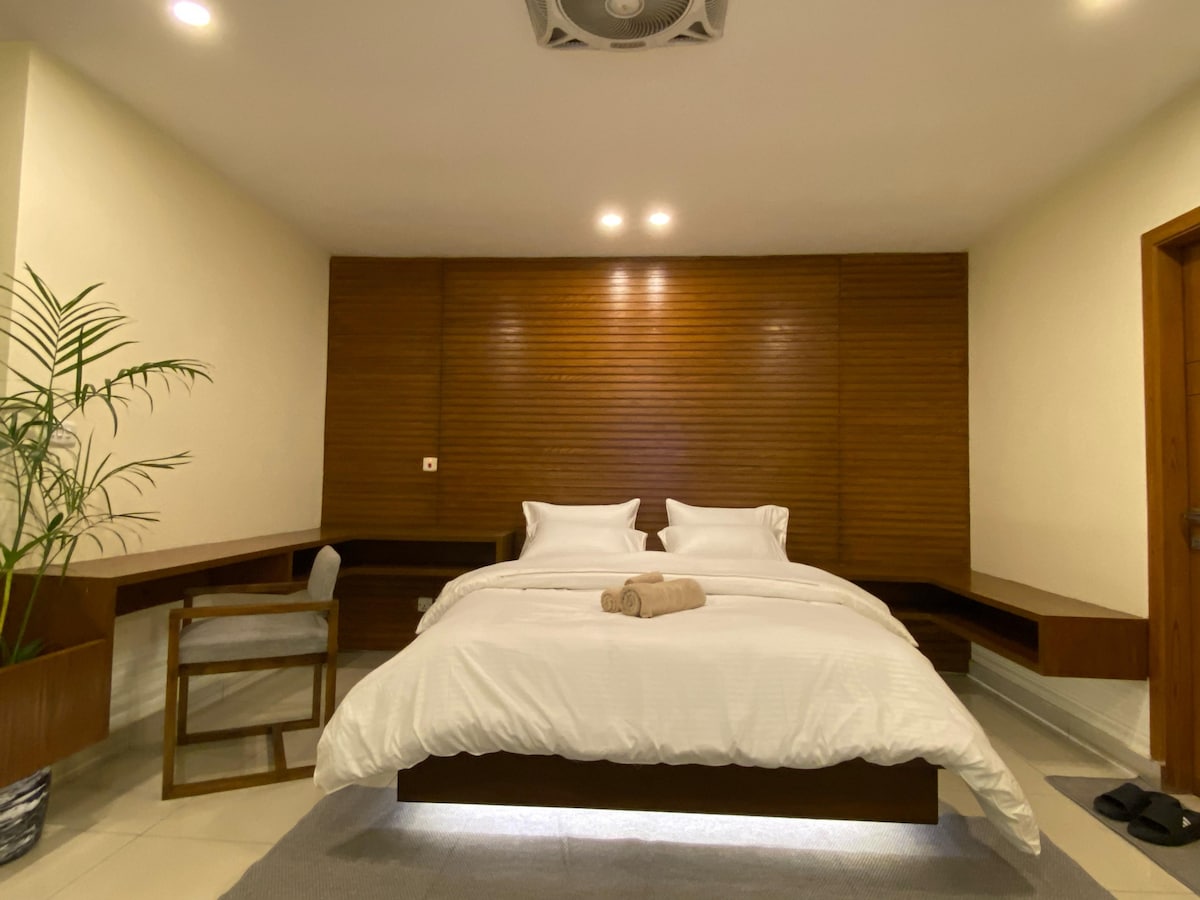 Stay in this modern, spacious apartment inside Zeta Mall, offering comfort and convenience. - Enjoy a one-touch coffee and tea dispenser for quick refreshments. - The apartment includes 24/7 UPS backup for uninterrupted power. - Guests can relax in the beautiful rooftop swimming pool with great views. With its clean interior, premium design, and prime location near key attractions, it’s perfect for guests seeking a luxury, well-connected stay in Islamabad.