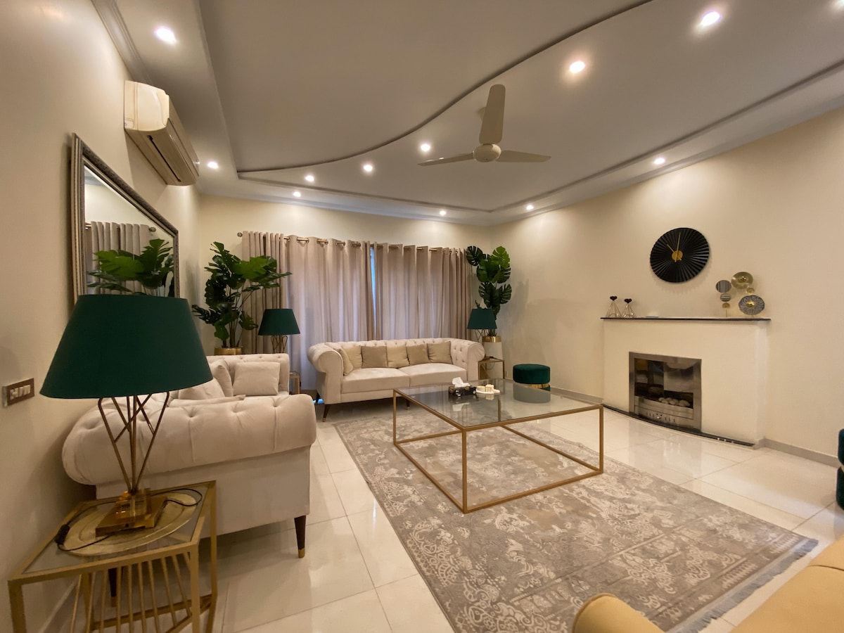 ★AWARDED SUPERHOST BY AIRBNB FOR OUR GUEST RATINGS! ★ 1 kitchen, 1 breakfast kitchen, 2 living rooms, 2 terrace, dining room, tv lounge (back and front facing). Amazing location, very close to restaurants, mosque, malls (packages mall), and international standard supermarket. 15 minutes from Lahore international airport. 5 minutes from motorway and ring road, and gold crest mall . Parking space for two cars and 24/7 houseboy service and security. ★ check us out on insta @thevillainndha
