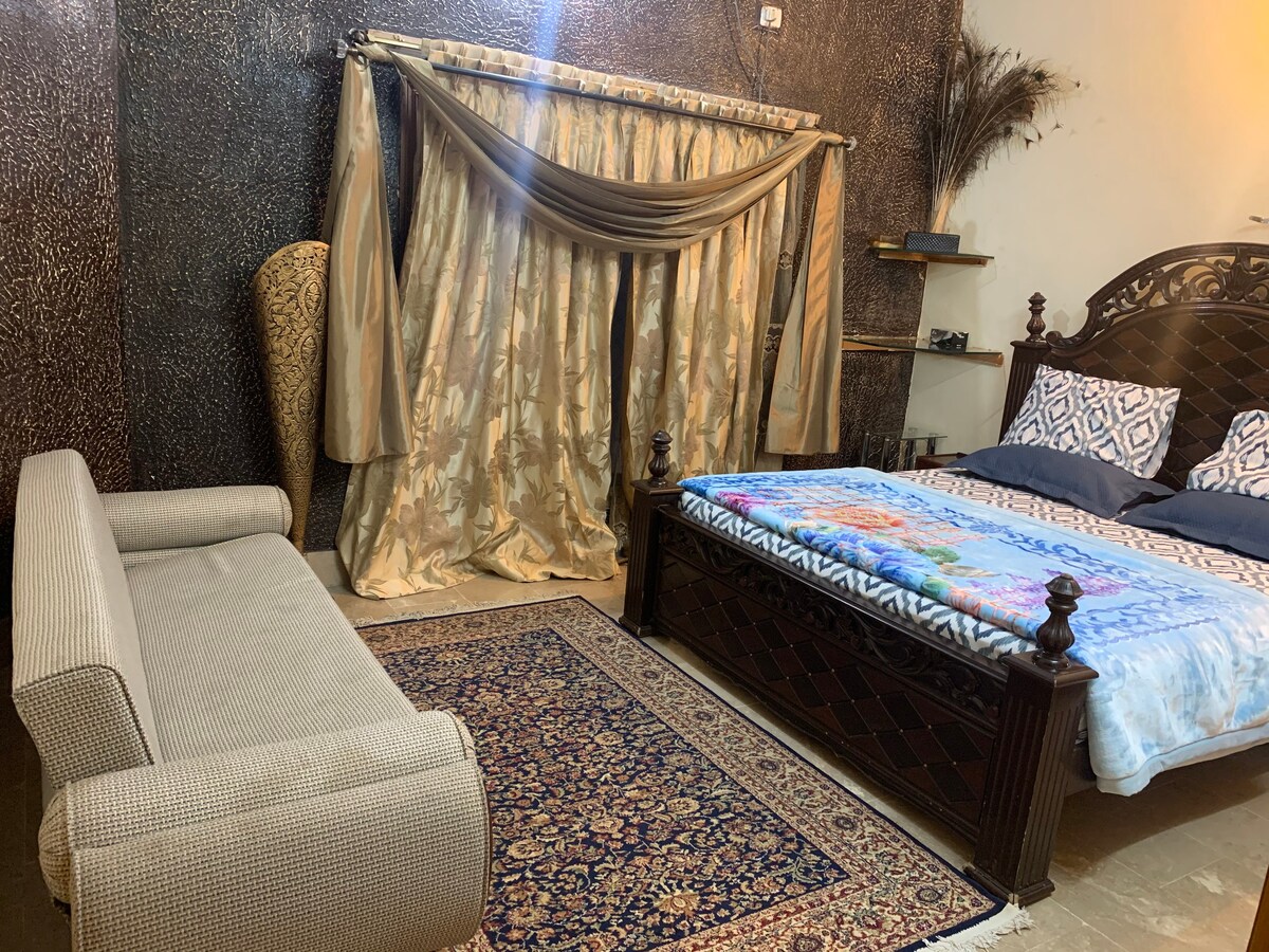 Welcome to our exquisite Airbnb located in the heart of serene and upscale community of Phase 5 DHA, offering a luxurious stay in a fully furnished modern unit.Bedroom with attached bathroom.Enjoy Spacious Lounge with Private Open to sky Bbq area,along with Open Kitchen and dining area.Parking on site. Discover convenience and scenic views at this stunning retreat. 3-min walk to Sector Park 7-min walk to Penta Square Mall and commercial area 15-min drive from Alama Iqbal International Airport