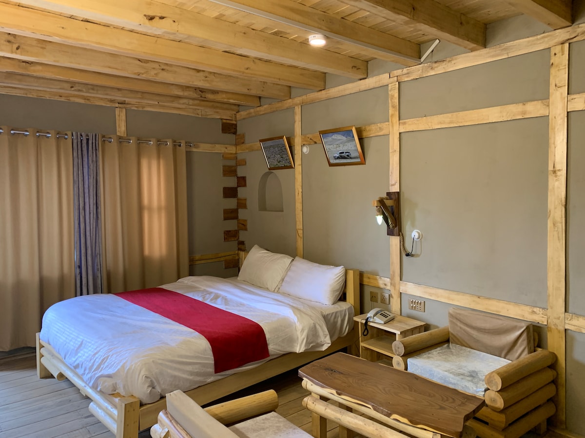 Stay in the center Experience a "Cultural Reflection" at Zimsa Organic Resort. Our Standard Room is a handcrafted masterpiece built with 800 years of tradition using Kath Koni architecture. Two comfortable twin beds with premium linens. A private attached washroom featuring unique Sea Stone walls and 24/7 hot water. Large windows offering panoramic views of the Skardu Valley and mountain peaks.