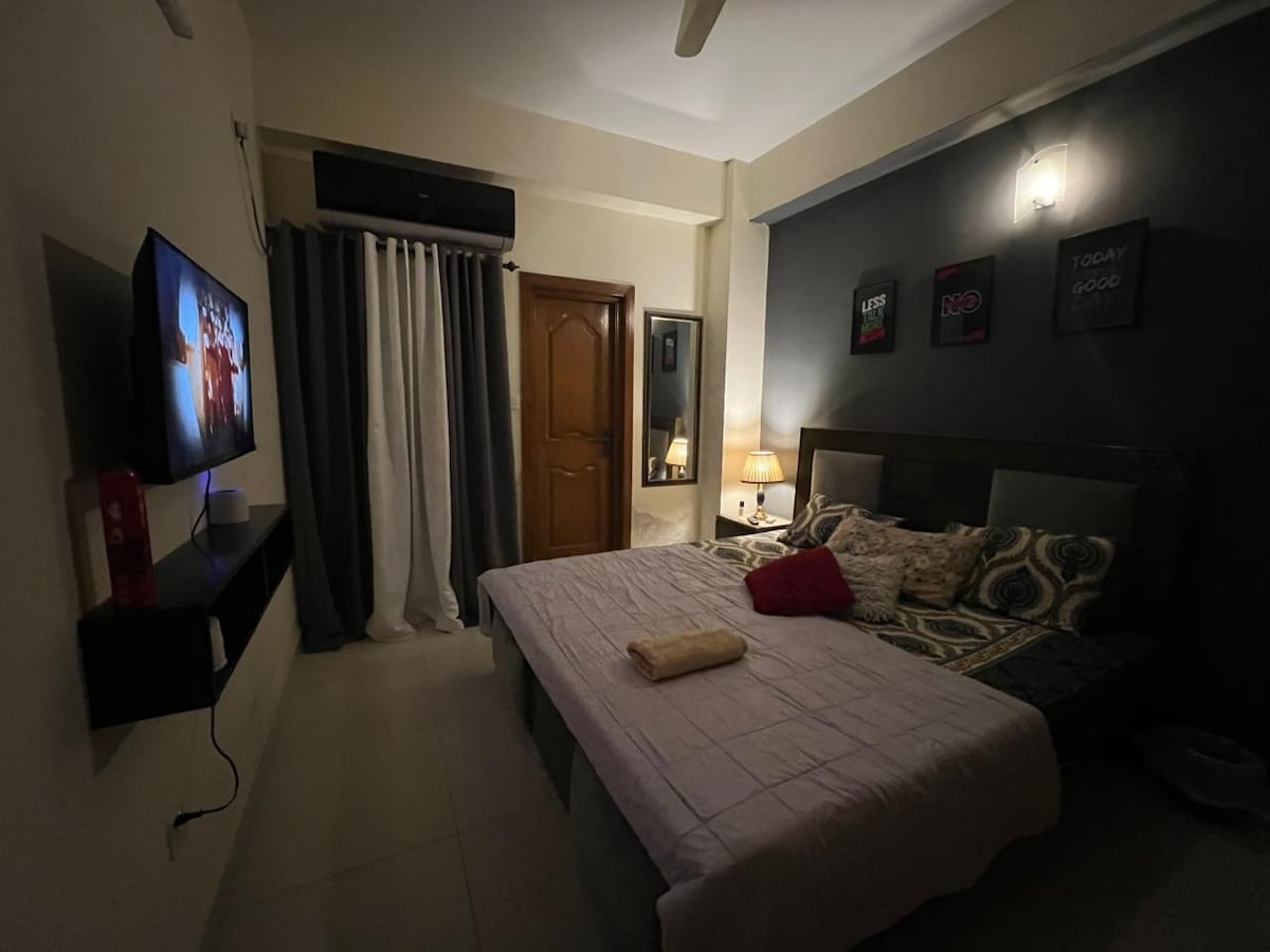 Discover our cozy one-bedroom apartment, perfectly located in the heart of Islamabad. Ideal for Families, couples, solo travelers, or business professionals, this stylish space offers comfort and convenience for your stay. ► Modern interiors: spacious bedroom, sleek kitchen, cozy living area. ► Building features Coffee Beans & Brim – dine-in or takeaway!. ► Amenities:High Speed Wi-fi, Free Parking, garden, 24/7 security. ► Family-friendly, centrally located – everything at your doorstep