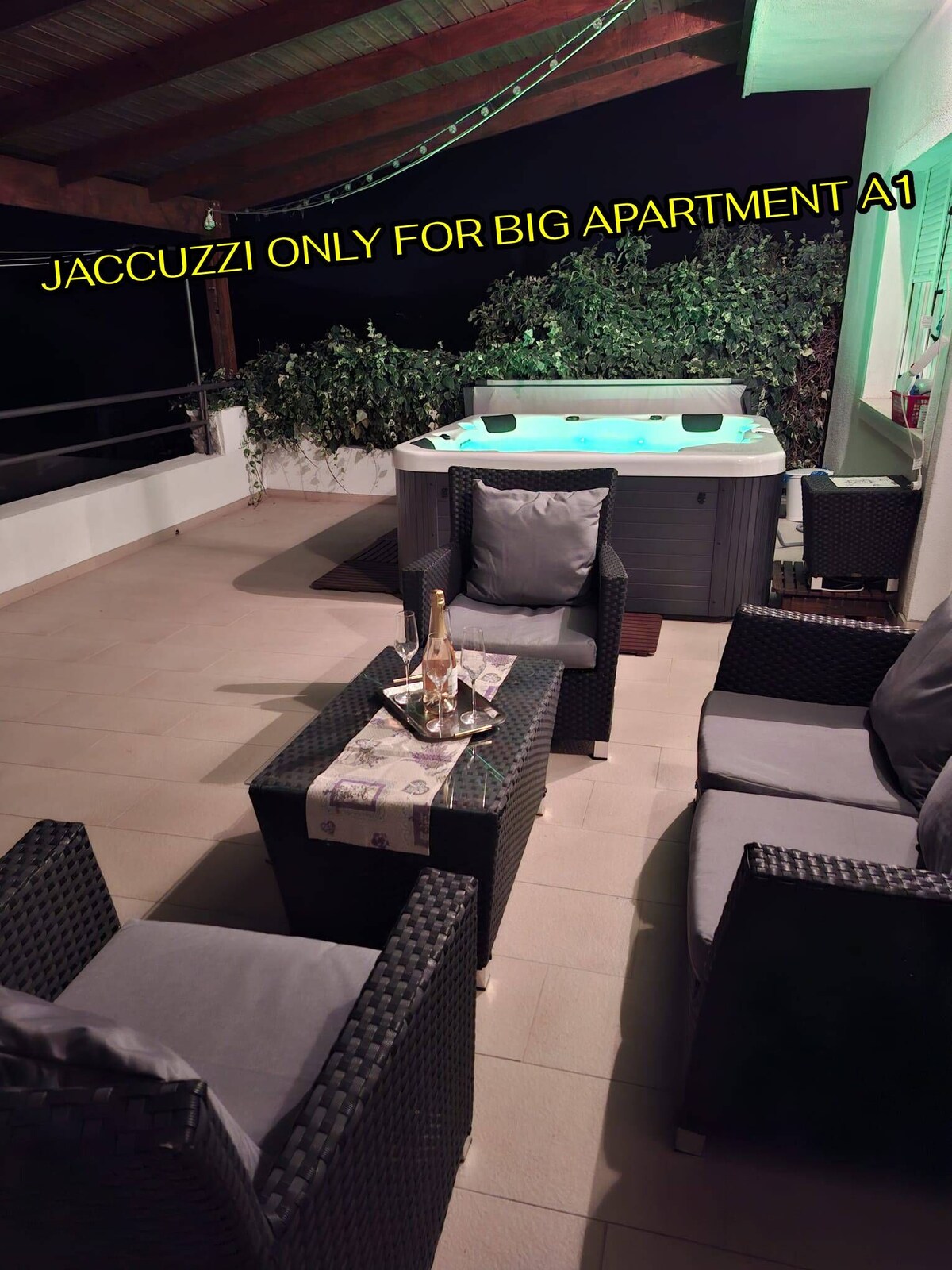 GT is spacious top floor apartment, with 2 private rooftop terraces, featuring outdoor Jacuzzi. There are 2 en suite bedrooms, kitchen,dinning/living area with a fireplace. Second floor features a study/office room which opens to two rooftop patios, one for lounging and enjoying the Jacuzzi, while the other has an outdoor kitchen with a traditional wood burning grill and an outdoor dinning area.