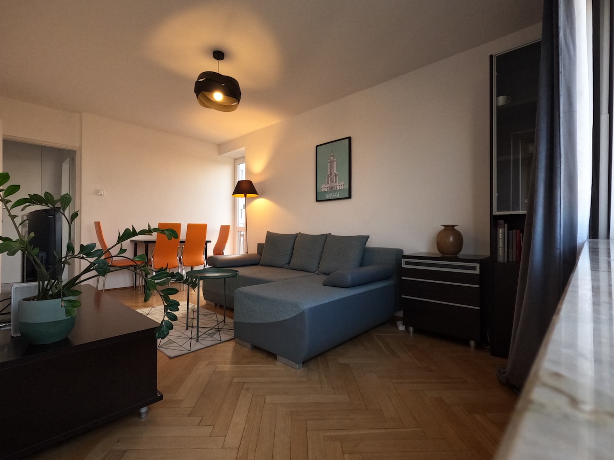 Spacious, bright two-room apartment after renovation in the heart of the city. The apartment is located on the second floor of a building with elevator. From the windows there is an extraordinary view of the Palace of Culture and Science. The building is located 5 minutes from Central Station. Contemporary interior design with vintage elements create a unique ambience ideal for a holiday or a business trip.