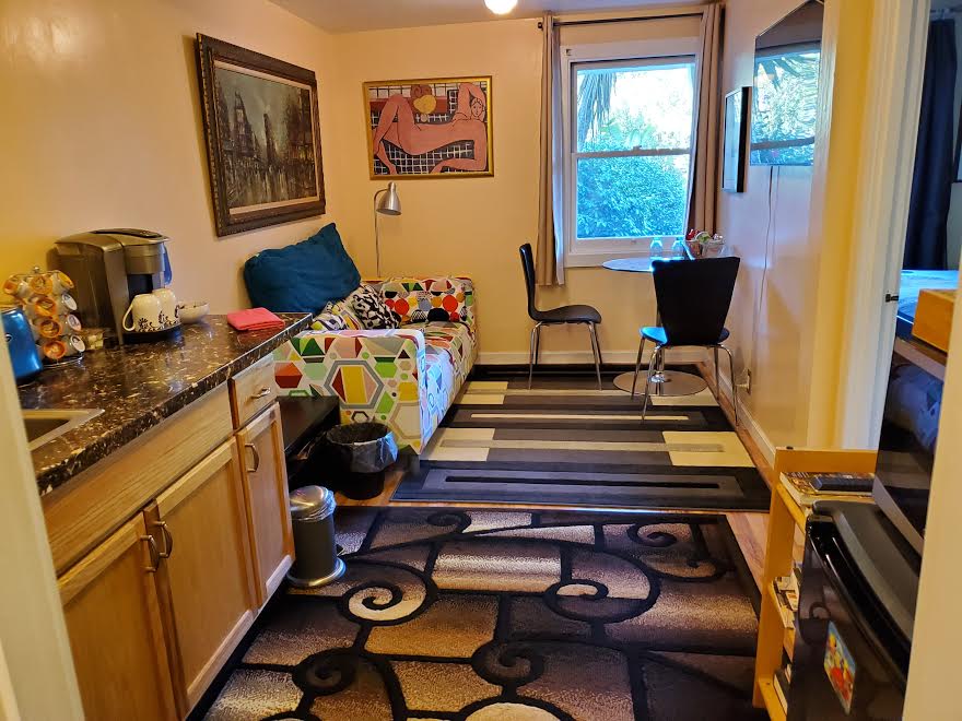 Garden suite with a private entrance attached to an occupied family home. Well located neighborhood with gorgeous architecture and the natural beauty of the Presidio forest so close by. Facing our lush garden are a bedroom and a cozy sitting room w/kitchenette (microwave but no stove). Conveniently between the Marina, Fisherman's Wharf, Golden Gate Bridge, NOPA & Golden Gate Park, our unit is in just about the finest neighborhood in the city. Plus free and accessible street parking!