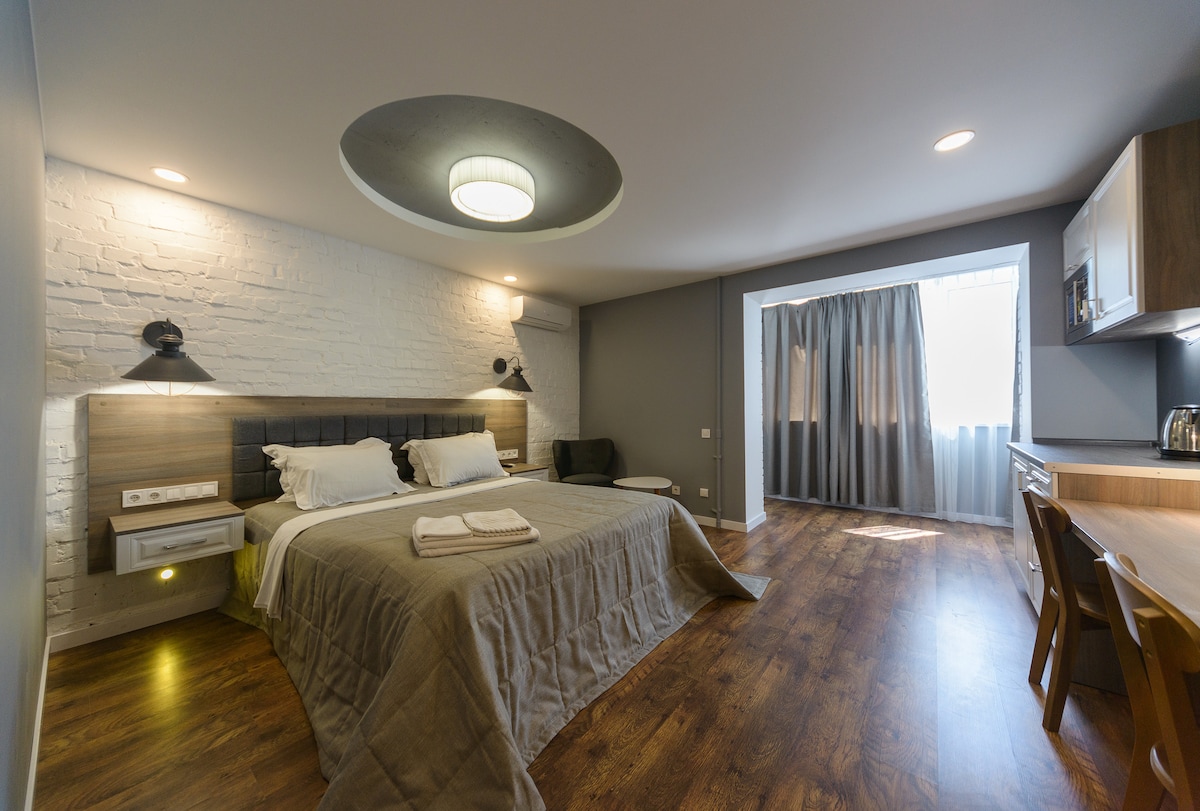 A cozy and modern hotel-type studio with elements of a loft style. The apartment is located on the 2nd floor. The building is located in the center of Kyiv near the shopping center "Gulliver", not far from the Olympic Stadium and Khreshchatyk Street, a 5-minute walk from the “Palace of Sports” metro station. The apartment has a king-size bed and, if it is necessary, an additional folding bed. The studio has a small kitchen, bathroom and toilet with everything you need, TV and Internet.