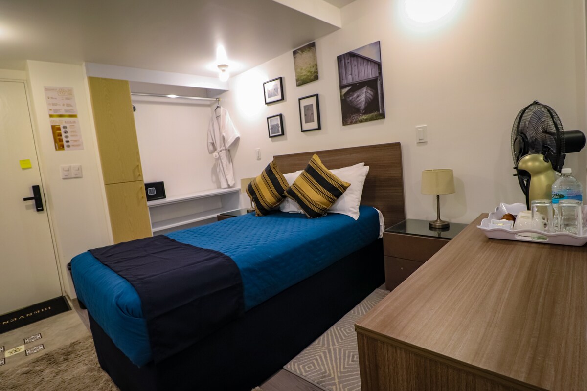 This spacious room has a king size bed, a private bathroom, and a fully equipped kitchen. The bed have a fresh linens and the bathroom has a shower and a hair dryer. The kitchen has a electric grill, a refrigerator, a microwave, and a coffee maker. There is also a dining table. The room is located in a safe neighborhood.