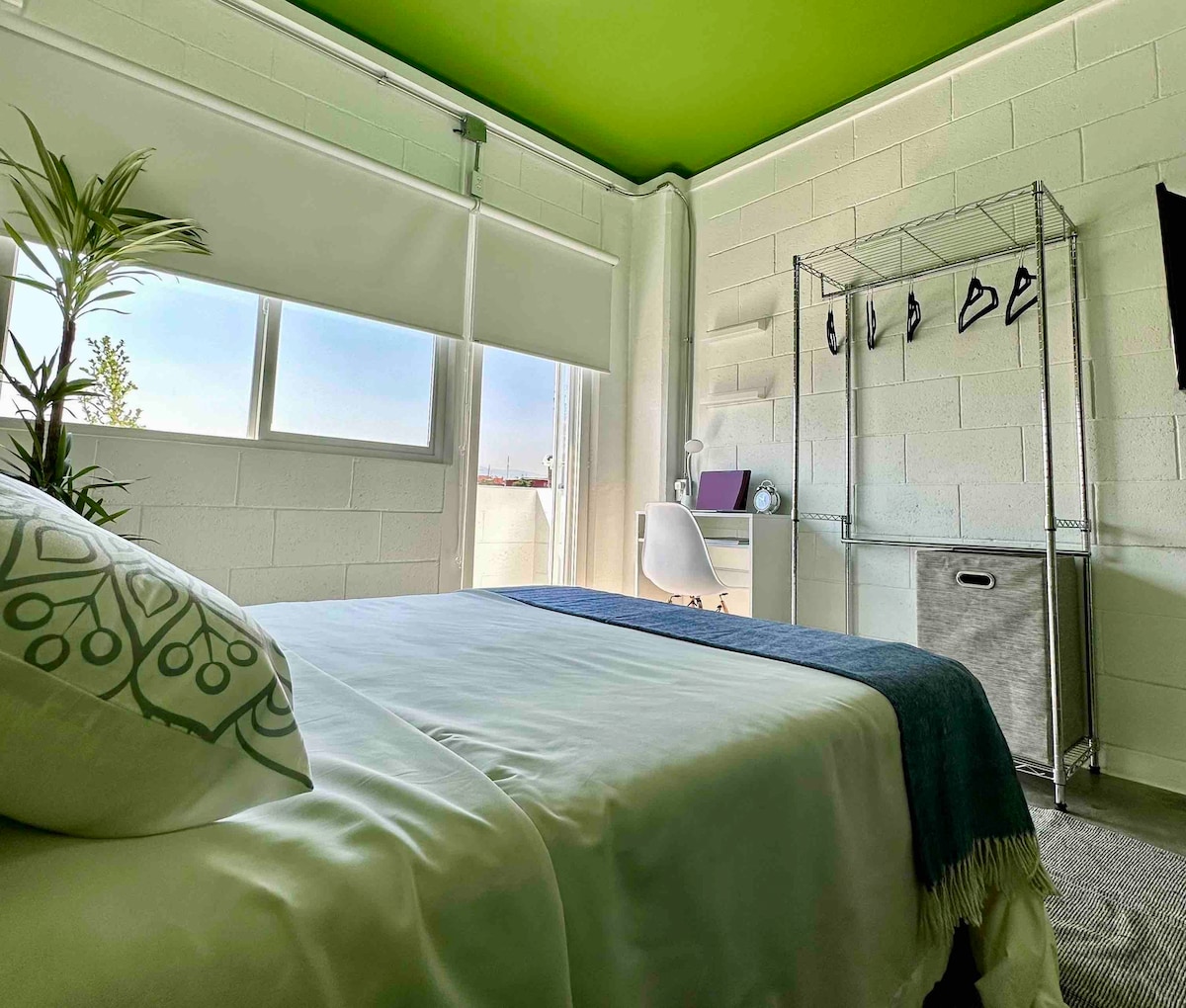 El loft con patio privado, coworking y gimnasio se encuentra en una posición estratégica de regeneración urbana, a 7 minutos a pie de la estación de metro y las áreas más interesantes de la ciudad. Cuenta con comodidades modernas como control automatizado con Alexa, una cama de memory foam y una regadera con hidromasaje. Además, ofrece estacionamiento en el sótano y vigilancia las 24 horas. Todo el loft está alimentado por energías renovables y utiliza tratamiento de agua pluvial.