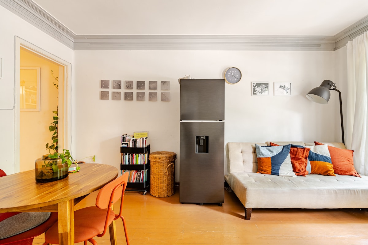 "Mexican traditions", located in a Porfirian building in Roma Norte, decorated with references to Mexican traditions. It has: spacious and equipped bathroom; washing machine strategically located; kitchen equipped with grill, microwave, and refrigerator; dining room with table and chairs for four people; living room with sofa and chairs to relax. Master bedroom with king-size bed, closet, TV and air conditioning. Access to the garden from the living room and bedroom. Ideal for extended stays.