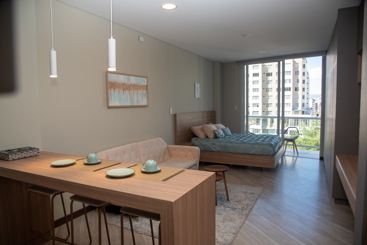 Hermoso monoambiente de lujo, con un hermoso balcón y vista a la ciudad, en la mejor zona de la ciudad, a pasos de Centros Comerciales, Supermercados, Restaurantes, Cines, Discotecas y Bares. Ideal para conocer la ciudad y sus principales atractivos o para viajes de trabajo. Tiene cocina, frigobar, tv, Wifi, microondas, un sofá cama, (opcionalmente, cuna, bañera y accesorios para bebe). y Adiciolmente el edificio cuenta con un cowork de lujo.