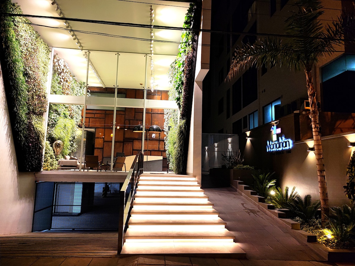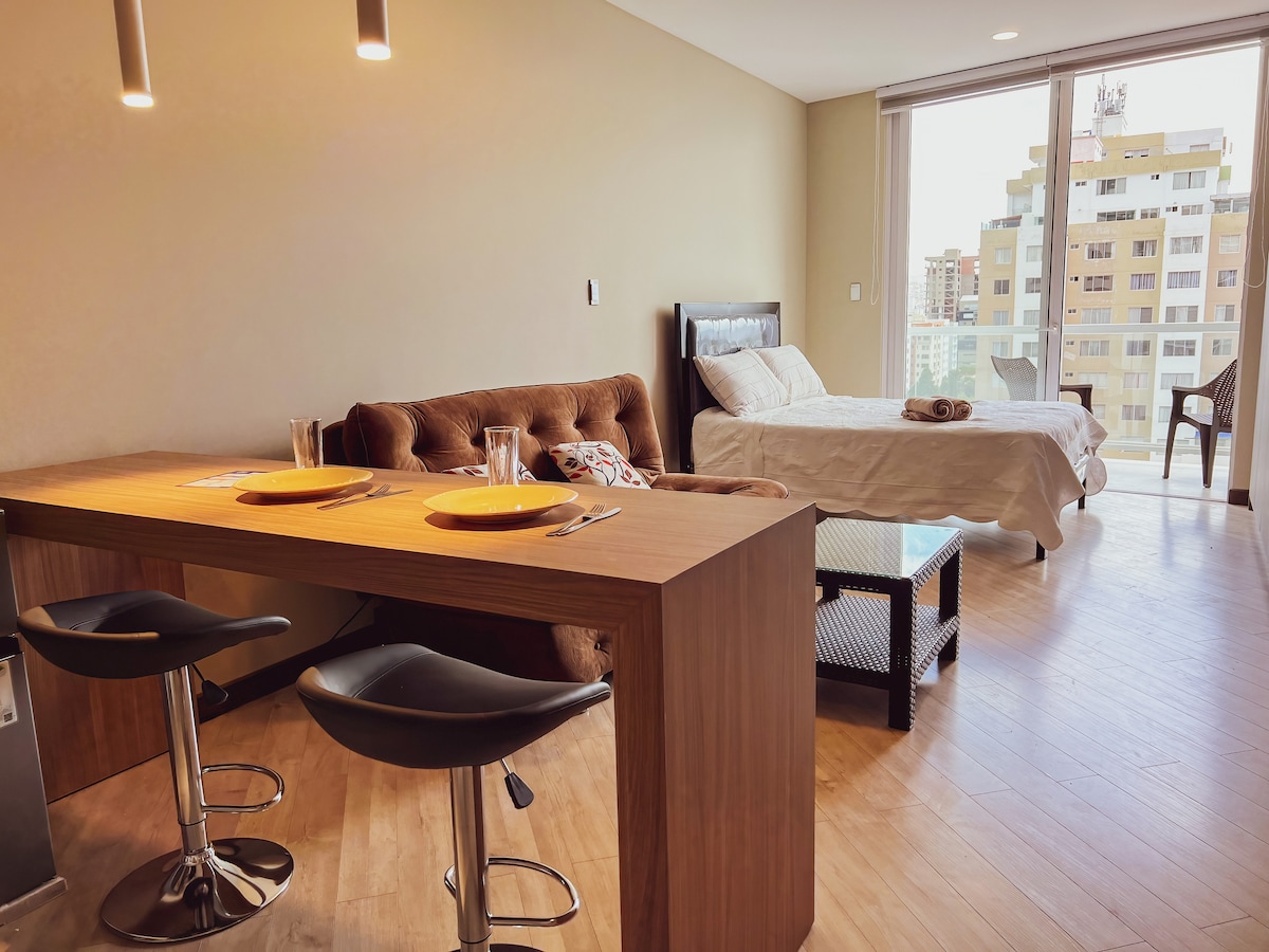 Hermoso monoambiente de lujo, con un hermoso balcón y vista a la ciudad, en la mejor zona de la ciudad, a pasos de Centros Comerciales, Supermercados, Restaurantes, Cines, Discotecas y Bares. Ideal para conocer la ciudad y sus principales atractivos o para viajes de trabajo. Tiene cocina, frigobar, tv, Wifi, microondas, un sofá cama, (opcionalmente, cuna, bañera y accesorios para bebe). y Adiciolmente el edificio cuenta con un cowork de lujo.