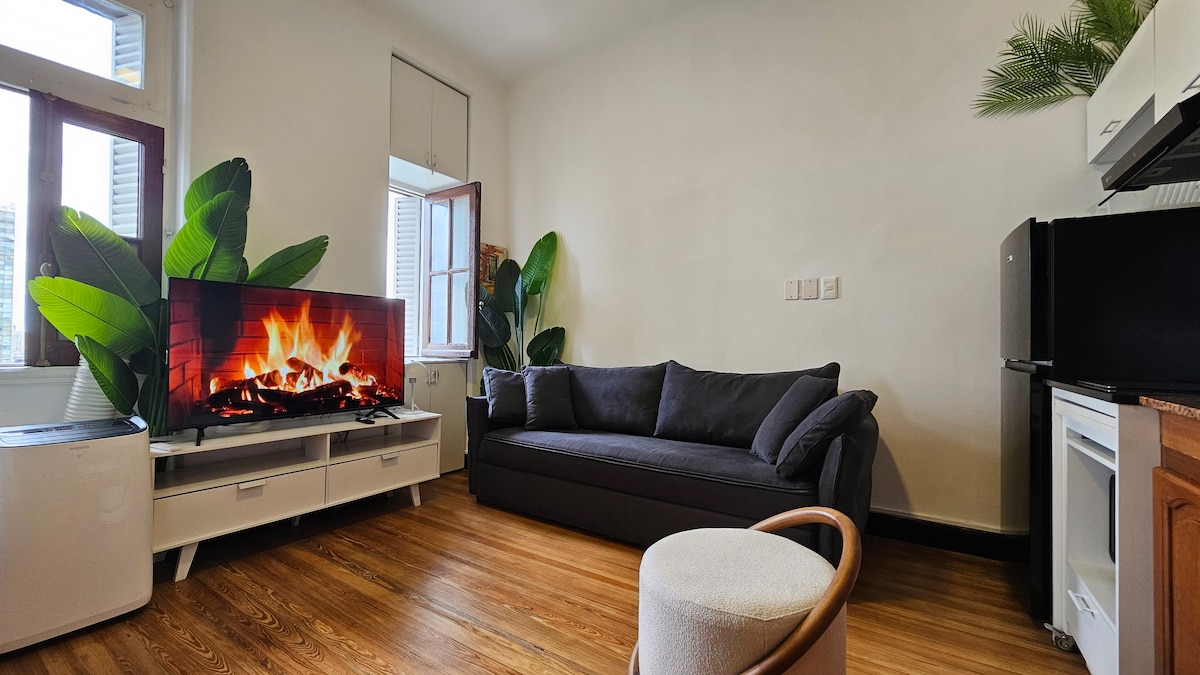 Modern 1-bedroom apartment in Parque Rodó. Bright and quiet, with large double-glass windows. Fully equipped kitchen with fridge, oven, microwave, utensils and tableware. Open living-dining area with 43" Smart TV and a home office space with Wi-Fi. Bedroom with queen bed and balcony access, plus a full bathroom. Excellent location: steps from Parque Rodó and the Rambla, surrounded by cafés, shops, and public transport at the door.