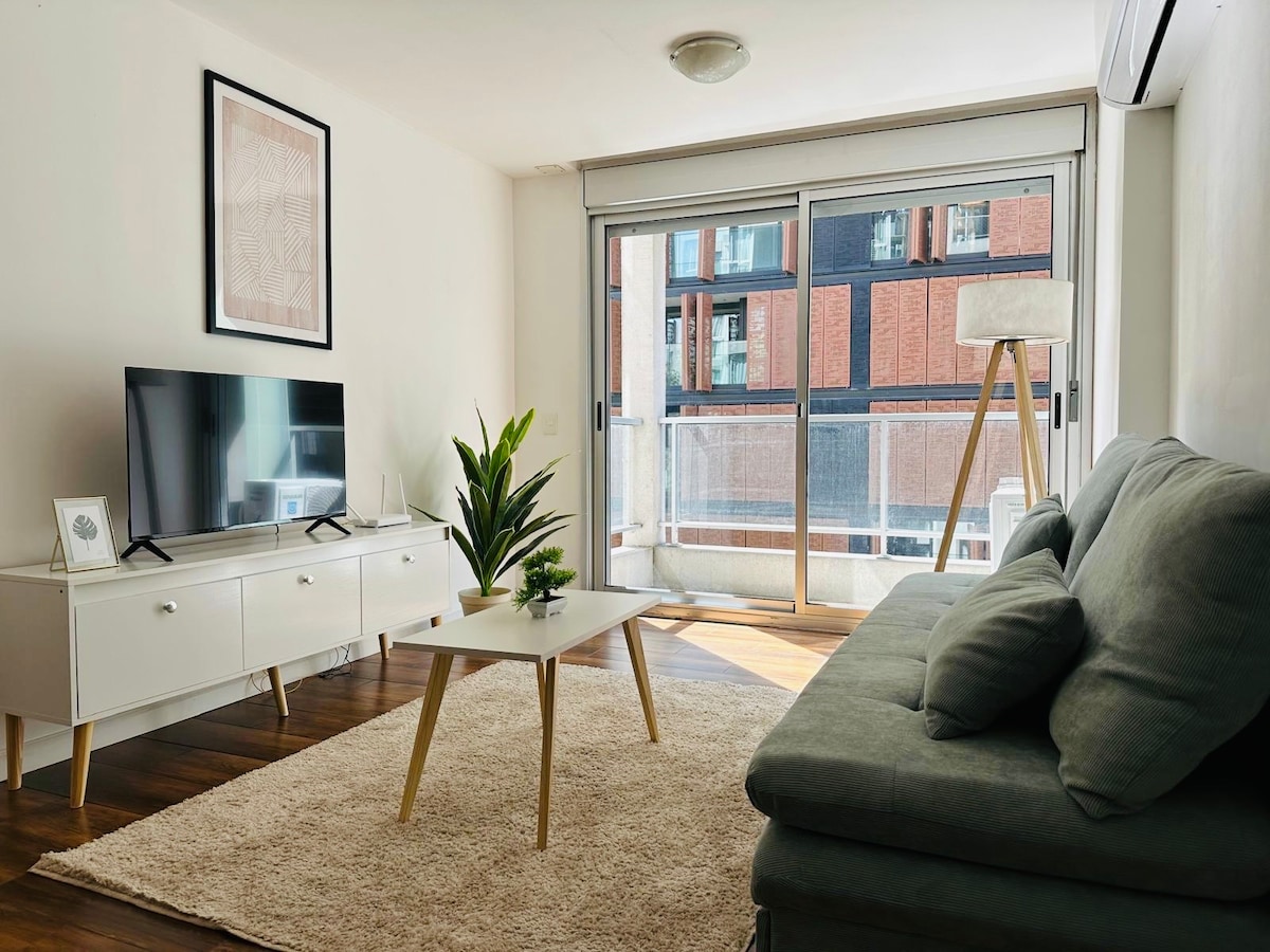 Apartamento céntrico a estrenar para hasta 3 personas, frente a Plaza Entrevero. Monoambiente muy luminoso con cocina integrada, baño completo, cama una plaza (rebatible), sillón cama de dos plazas. Totalmente equipado para 3 personas: ropa de cama (incluye abrigo), set completo de toallas, vajilla. TV Smart 40', Netflix. WIFI. Aire acondicionado Edificio nuevo, portería y ascensores. Ubicación ideal, pleno centro de Montevideo, a media cuadra de la avenida principal (servicios y transporte)