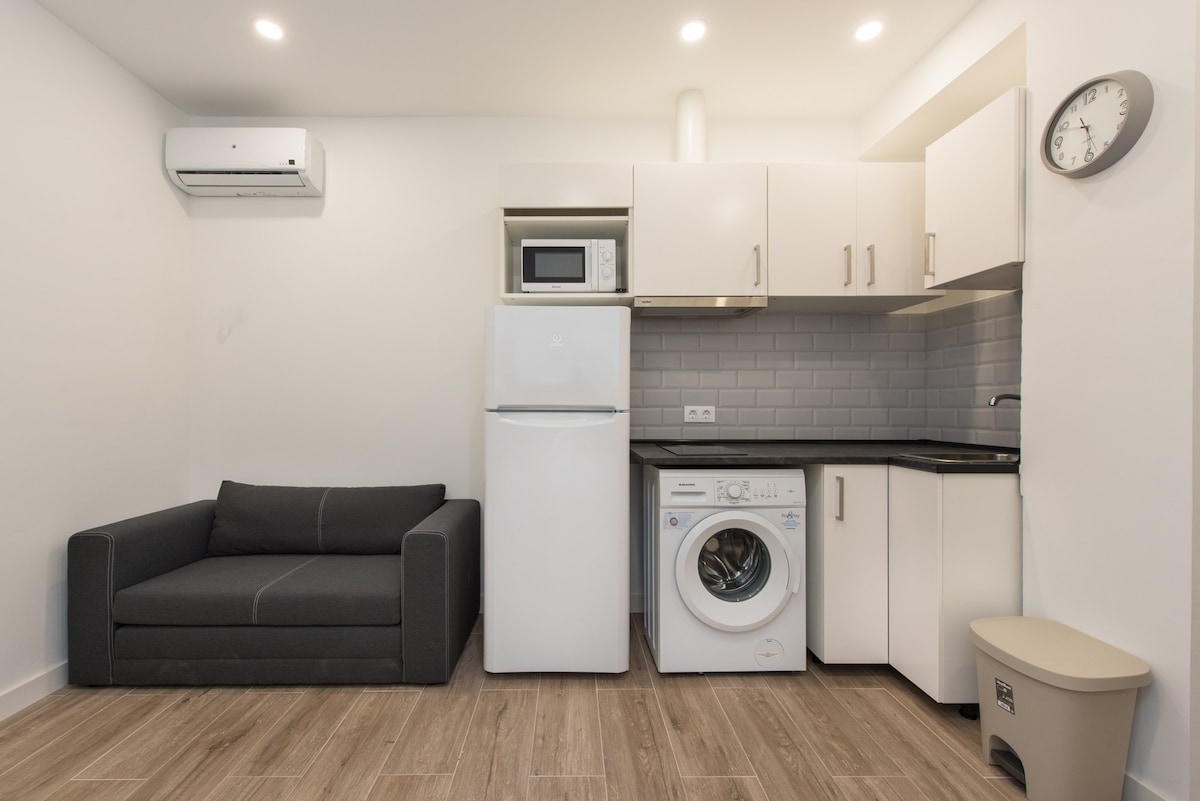Modern 1-Bedroom with Terrace in Vista Alegre /Carabanchel’s Arts District This stylish one-bedroom apartment offers modern comfort featuring a custom kitchenette, spacious bathroom, and a cozy living area with a sofa bed. It's ideal for a couple or 3 friends traveling. Enjoy a private terrace and easy access to two metro lines, a pedestrian shopping street, and direct bus to top landmarks like the Royal Palace and Plaza Mayor. It's a perfect blend of convenience, budget and style.