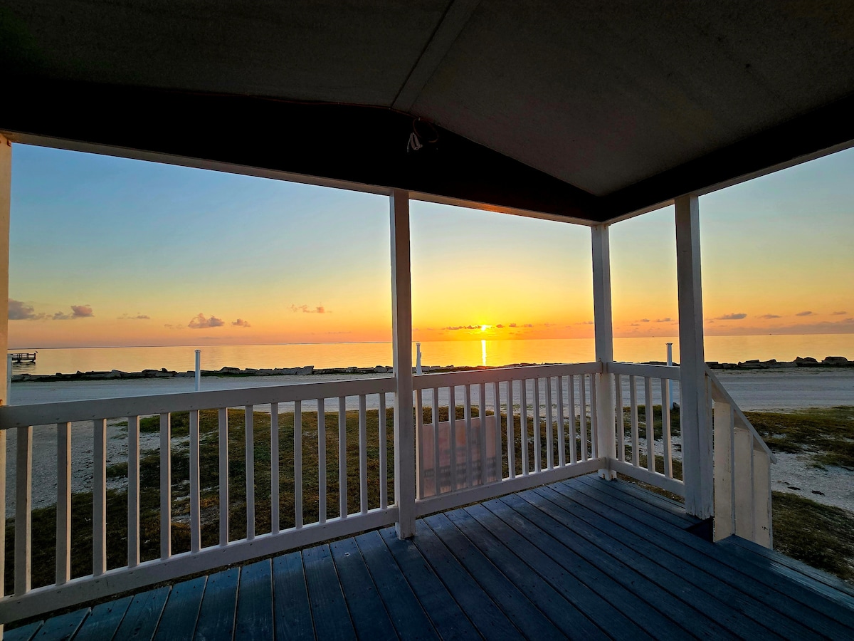 This is a fisherperson's, birding, and ocean lover's dream come true. The small waterfront cabin is on an elevated point overlooking beautiful Matagorda Bay and has its own private, lighted fishing pier. Redfish, Speckled Trout, Drum, crabs and other saltwater fish are abundant around the pier. Dolphins, birds and other sea creatures are everywhere. Ocean going ships navigate the ship channel. Salt air, ocean breezes, gentle waves and star filled nights are the ultimate stress reliever.