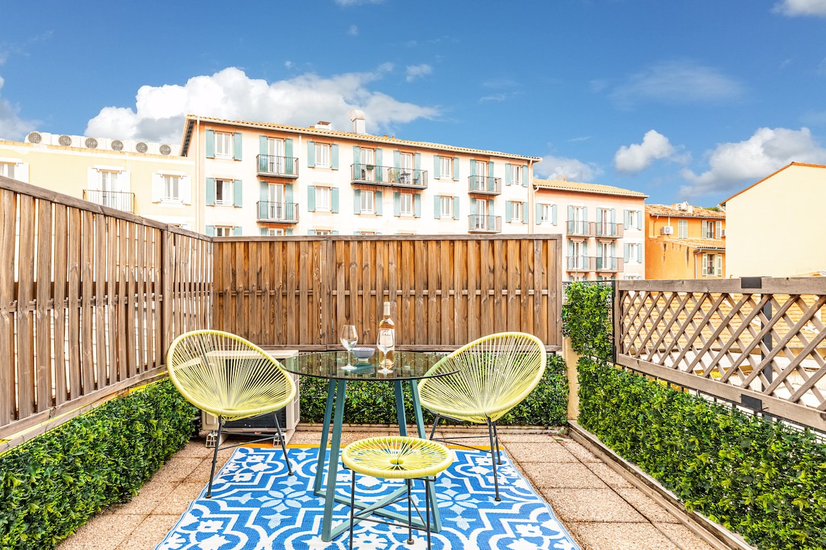 Newly renovated studio with a private sunny terrace located in the Antiques district close to the Port of Nice. The 24 m2 studio (+ 7 m2 terrace) has a light, airy open-plan living space including a fully equipped kitchen-diner, lounge/bed room with a top quality Italian fold-down sofa bed. Separate bathroom with spacious shower, WC and washing machine. It is on the 1st floor (US: 2nd floor) with an elevator. The new tram line - just 300m away - is a real advantage (see Getting Around below).