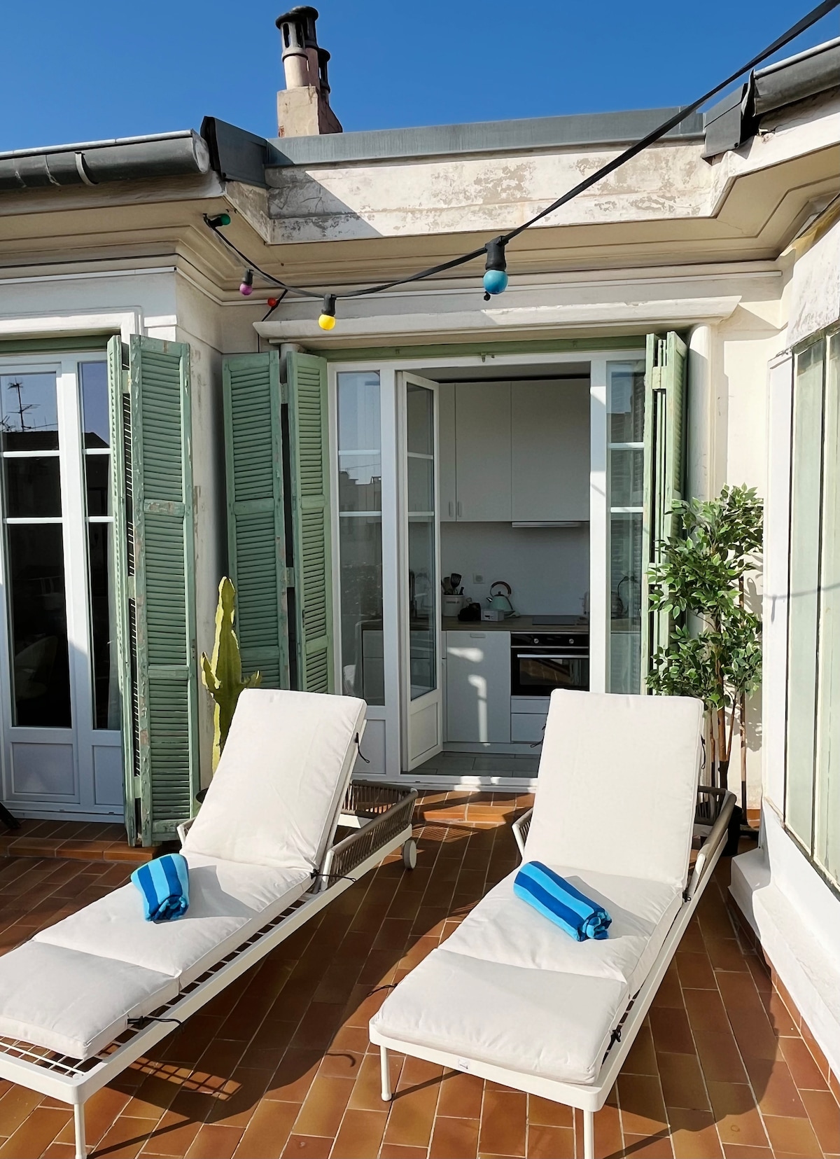 This charming renovated 38m2 1 bedroom and 1 leaving room apartment is located on the top floor without elevator (5th) of a typical 18th century building in the Old Nice. The apartment has a 10m2 terrace facing the castle hill and its magnificent waterfall; Located in the heart of the old town and 2 minutes walk from the sea, it will allow you to explore the center as well as the nightlife of the area. Many restaurants and shops are nearby. A stay with friends or as a couple is ideal!