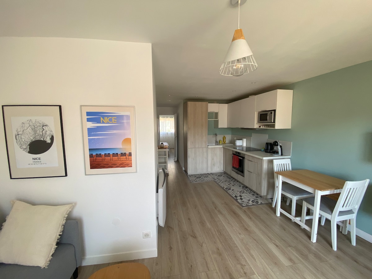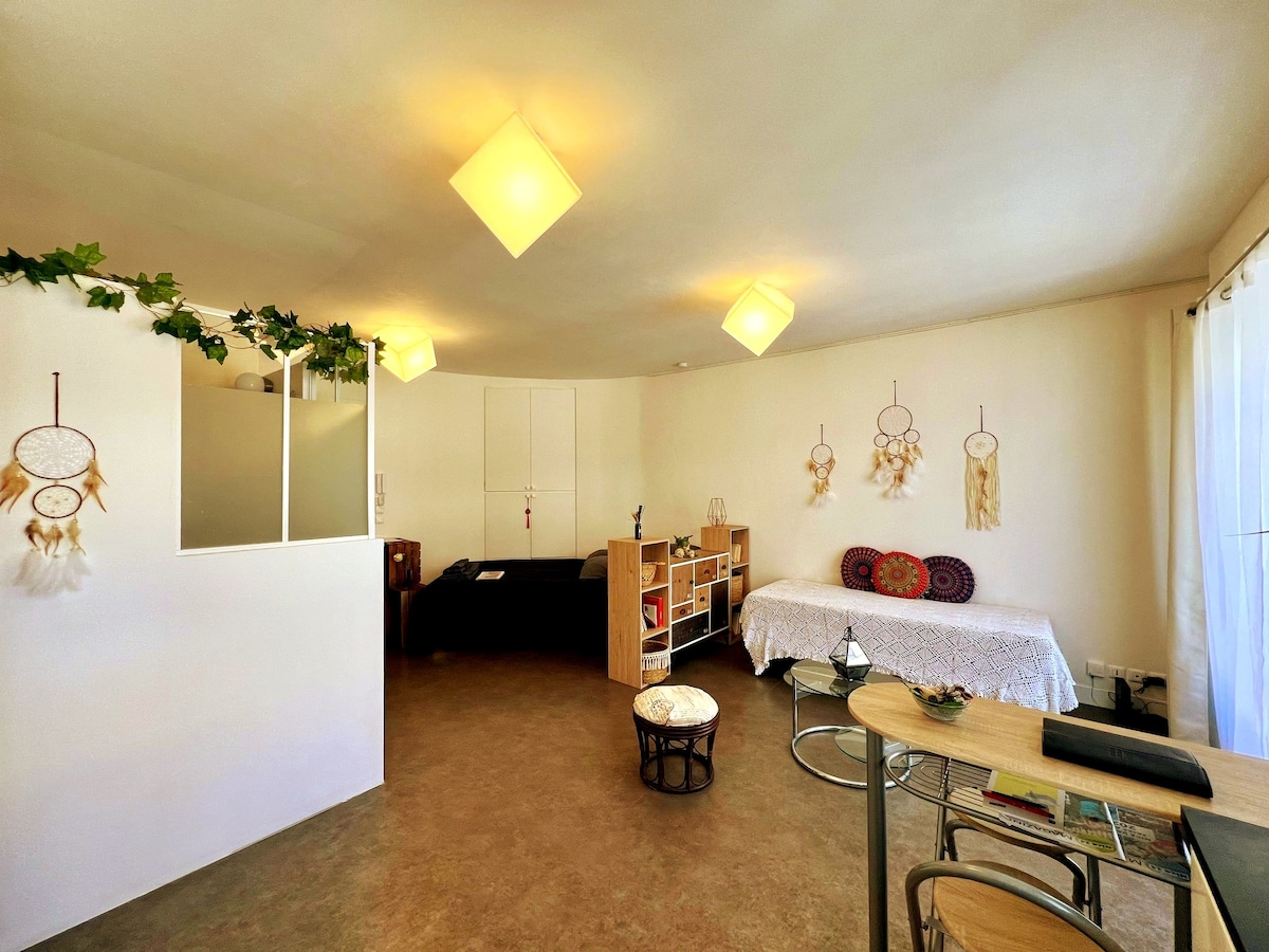 Petit STUDIO très bien équipée avec entrée et parking privé dans une grande Propriété avec piscine et jacuzzi chauffés du 10 avril au 30 octobre . La piscine extérieur et jacuzzi ainsi que le jardin sont partagés mais assez grand pour profiter chacun son espace de tranquillité . Je vis dans la bastide principale . Un Havre de Paix entouré d oliviers centenaires . A 35 minutes de l aéroport de Nice et divers villages provençaux et 14km de Cannes . Tele grand écran /abonnement Netflix