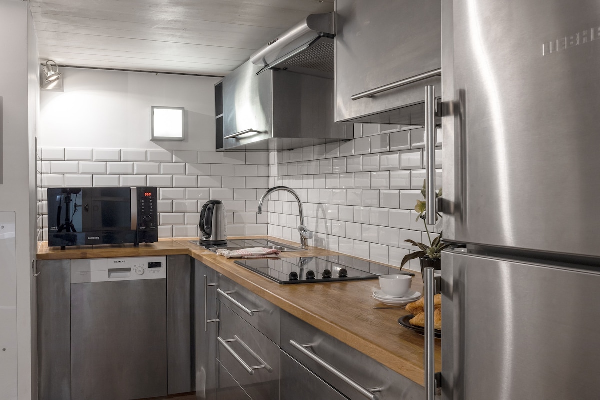 Our urban Loft is located at the limit of the 9th and 2nd by Boulevard Haussmann! The renovation of about 300sqf includes high ceilings, concrete floors, a fully equipped kitchen with a bar area – a living area with a futon bed, and a queen size bed on the loft. Located on the ground floor, the space stays cool during warm days. Enjoy walking to restaurants, bars, and fancy stores! 6 metro and buses minutes’ walk away!