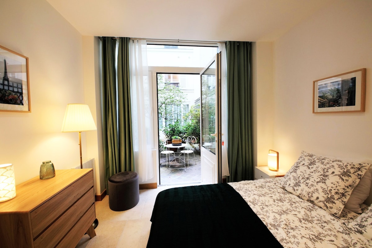 Luxurious and intimate, this secluded urban oasis is tucked away on a residential street in bustling Bastille, one of the most authentic and hippiest areas of Paris. Surrounded by some really good restaurants, farmer markets, designer stores and art galleries, it offers all the amenities you would find in a 5-star hotel, including a secluded private outdoor patio with its lush greenery. Famous Place des Vosges and Le Marais are just a short walk away.