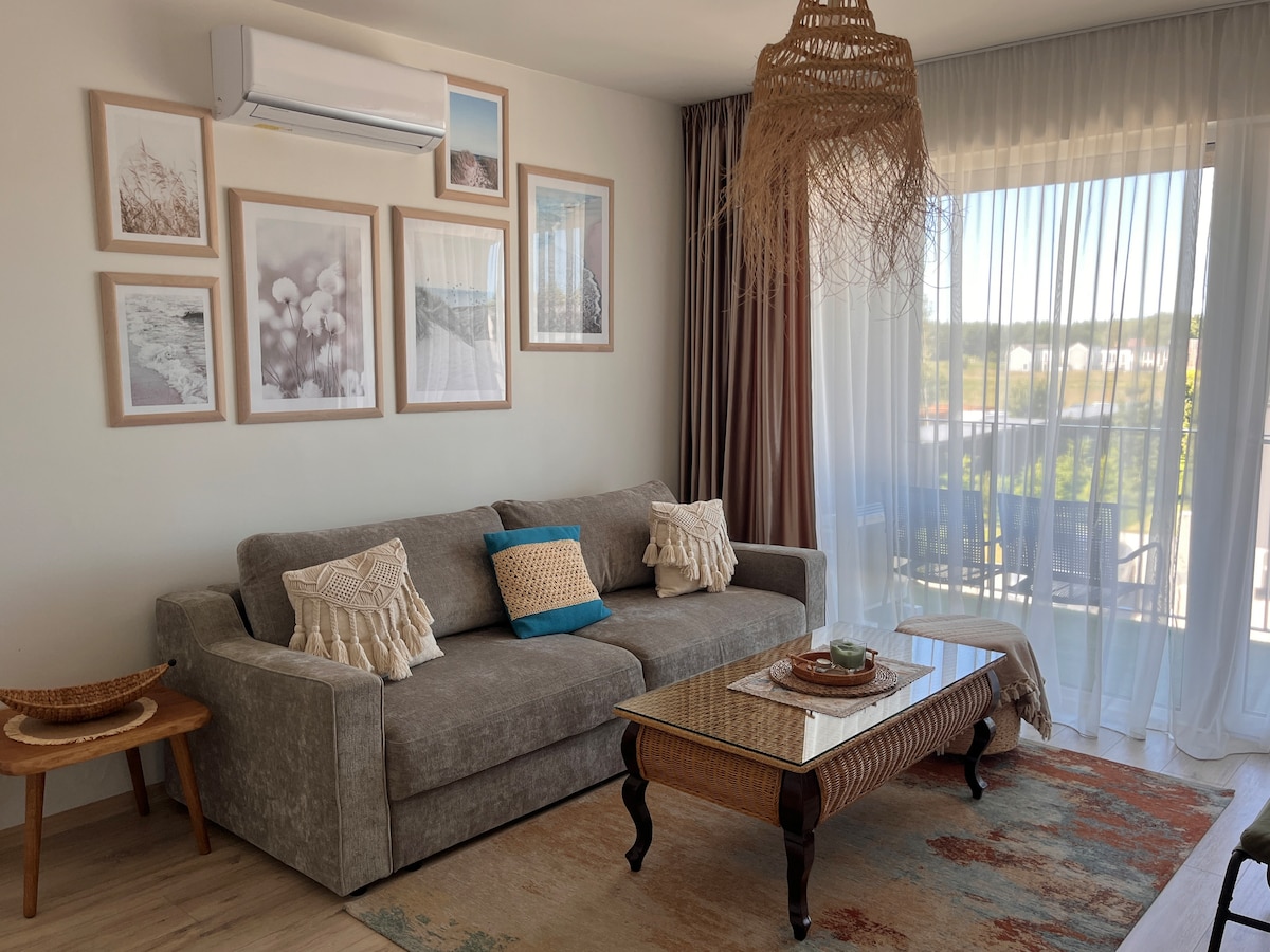 Come enjoy this stunning apartment with a balcony just 6min walk to the sea. This new, modern place is everything you need for unforgettable holidays with your family or friends. You will find a relaxing atmosphere here: shining kitchen, living room, a balcony, dreamy bedroom with a comfortable bed and a clean, white bathroom.