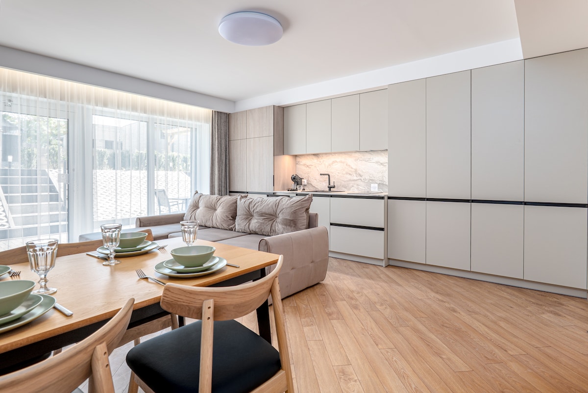 Apartament in "Hill Garden" residence. When furnishing the apartment one of the main considerations we had was to combine functionality and style. The place is ideal both for a couple and a family, with a separate bedroom, and a sofa-bed in the living room that takes just seconds to prepare – we got surprised ourselves how easy it is to fold and unfold. We are looking forward to welcome you in Kunigiskes, and we are convinced you would be eager to come back!