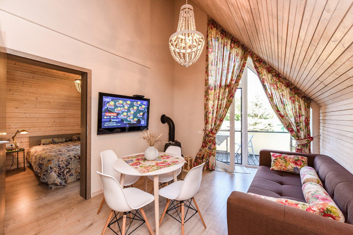 Naujai įrengtas kotedžas su asmenine lauko terasa. Pirmame aukšte yra svetainė sujungta su virtuve, tualetas. Antrame aukšte du atskiri miegamieji. Apartamentuose rasite ko gali reikėti buvimo metu: grilių (iešmai, kepimo grotelės), arbatinukas (arbata, kava), šaldytuvas su šaldymo kamera, kaitlentė, skalbimo mašina, plaukų džiovintuvas, lygintuvas, lyginimo stalas.