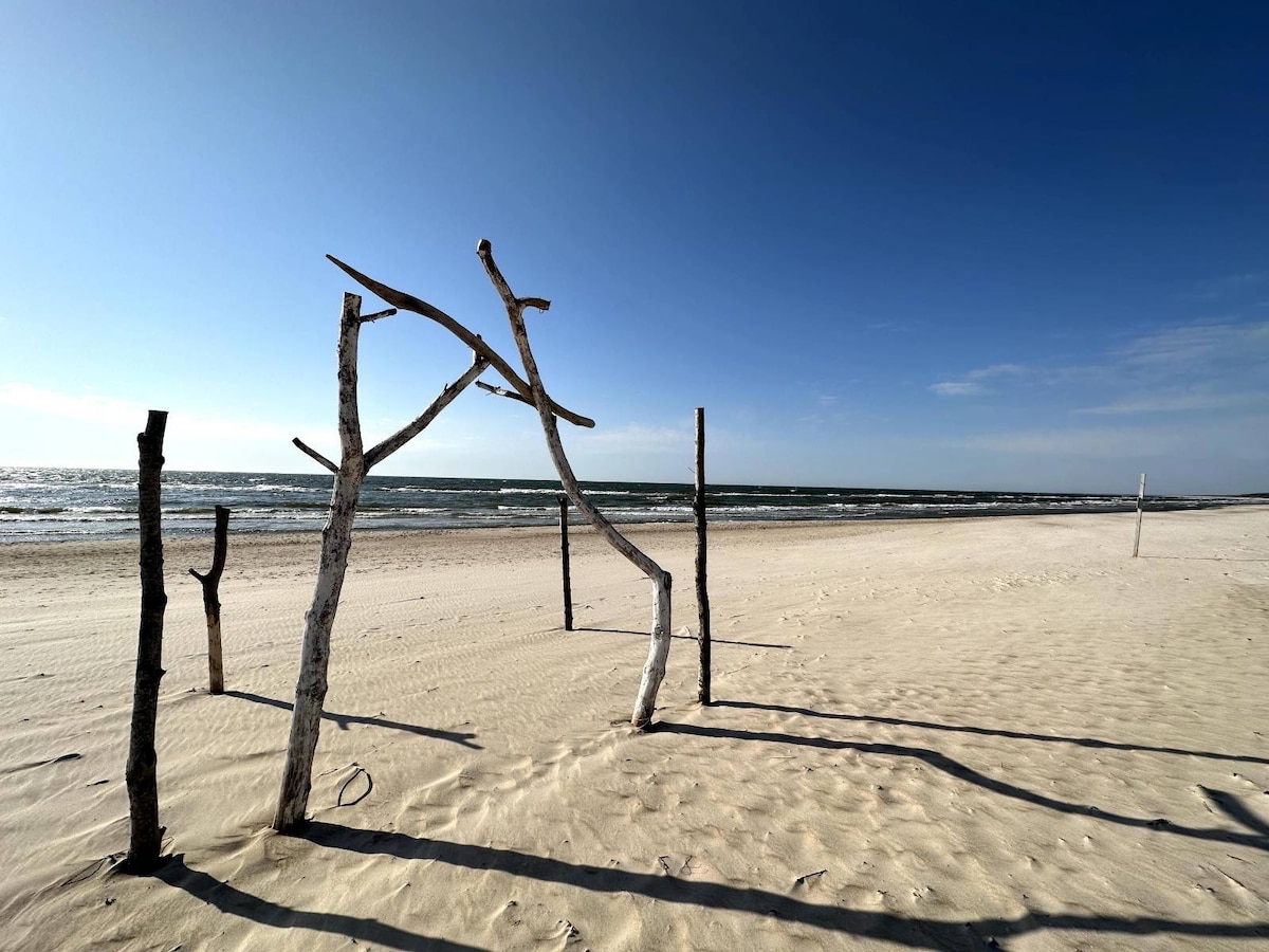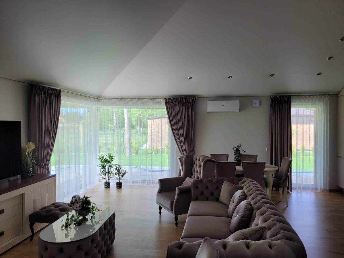 A new modern cottage with private backyard near the sea (10 min by foot). Here You will find everything You need for your family or friends holidays or workation. The space ~42 m2 First floor - living room, kitchen and bathroom. Second floor - two bedrooms with double beds. One of the bedrooms has dedicated work space. For comfortable stay : Wifi internet, TV, microwave, fridge , washing mashine, dryer, kitchen ware, bed linen and towels. Private parking. Terrace. Enjoy life by the sea!