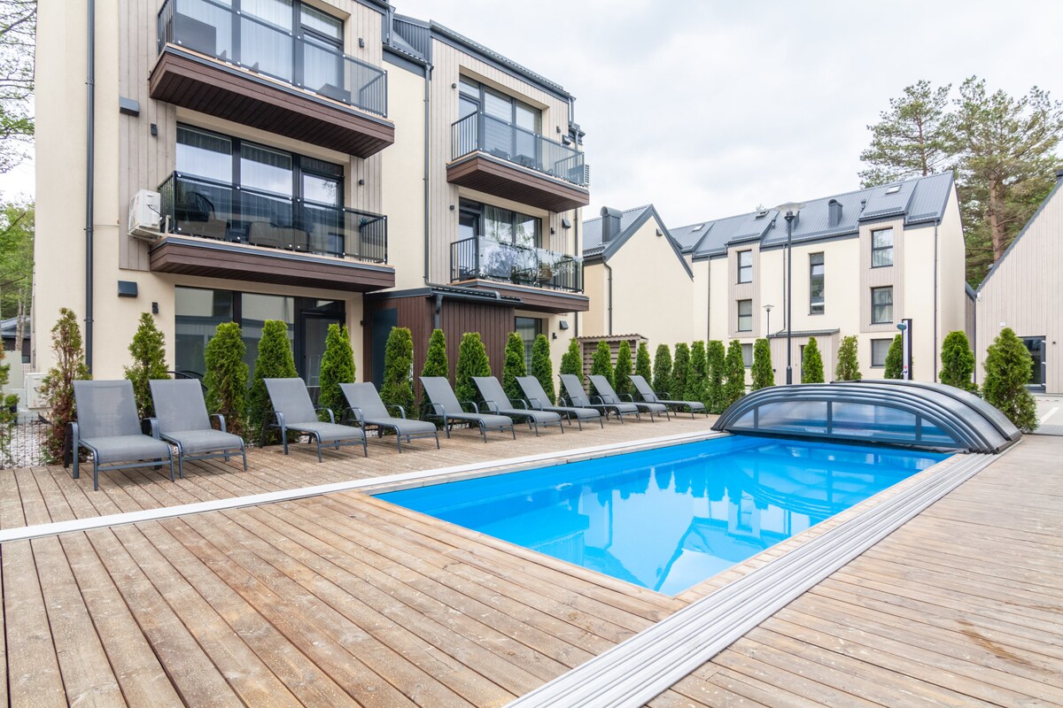 New stylish condo in private “Mano jūra 2” complex with heated swimming pool, jacuzzies, grill areas, sauna outside. Baltic sea is 900 meters pleasant walk from apartment. Seafood restaurant is 400 meters outside the property. Studio has private parking place. Balcony has pool view!