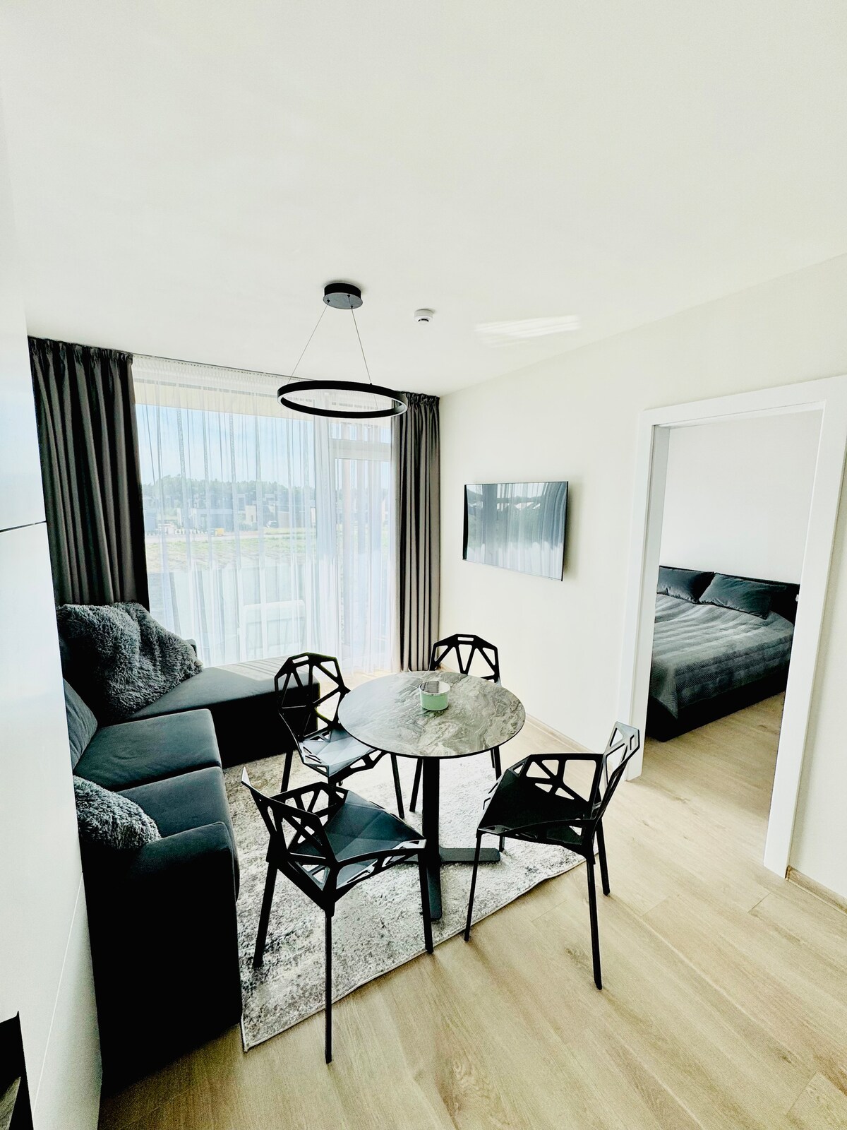 Welcome to Vija Home by Infinitum Sea – your modern getaway in Palanga, Kunigiškės. Located just a short walk from the beach and minutes away from Palanga Airport, our stylish 2-room apartment offers everything you need for a comfortable and relaxing stay by the sea. Enjoy infinity swimming pool, heated pool with underwater streams, wine glass in the balcony watching sunrise. On weekend evenings, enjoy family movies and live sports events on a big screen by the pool. Extra: 40€ - cleaning fee