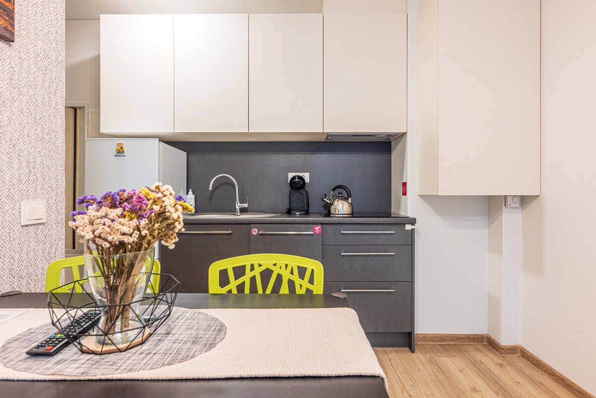 Apartament in "Hill Garden" residence. When furnishing the apartment one of the main considerations we had was to combine functionality and style. The place is ideal both for a couple and a family, with a separate bedroom, and a sofa-bed in the living room that takes just seconds to prepare – we got surprised ourselves how easy it is to fold and unfold. We are looking forward to welcome you in Kunigiskes, and we are convinced you would be eager to come back!