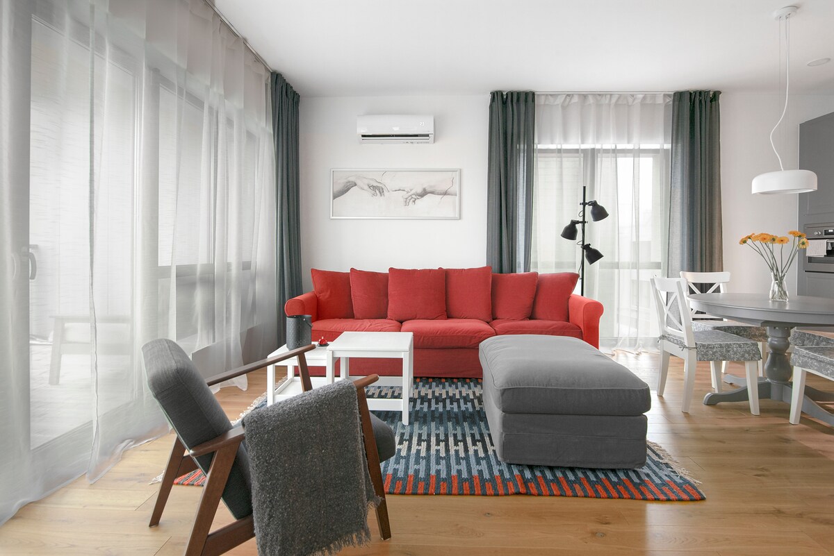 Wow Wow Wow this is one of the best Apartment in the whole Sventoji and Palanga Area! This unique place has a style all its own. Fall asleep to the sound of sea waves in this charming beachfront apartment. The light, airy home features open-plan living and a wall of windows to maximize the amazing views. Enjoy drinks on the terrace and a sunset over the water—it's pure bliss. Free parking and wifi is a bonus.