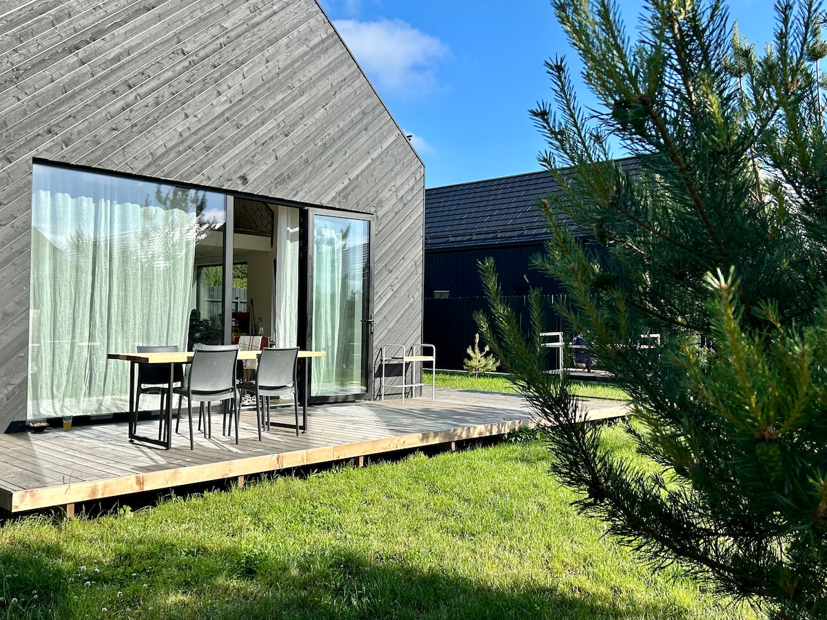 A new modern cottage with private backyard near the sea (10 min by foot). Here You will find everything You need for your family or friends holidays or workation. The space ~42 m2 First floor - living room, kitchen and bathroom. Second floor - two bedrooms with double beds. One of the bedrooms has dedicated work space. For comfortable stay : Wifi internet, TV, microwave, fridge , washing mashine, dryer, kitchen ware, bed linen and towels. Private parking. Terrace. Enjoy life by the sea!